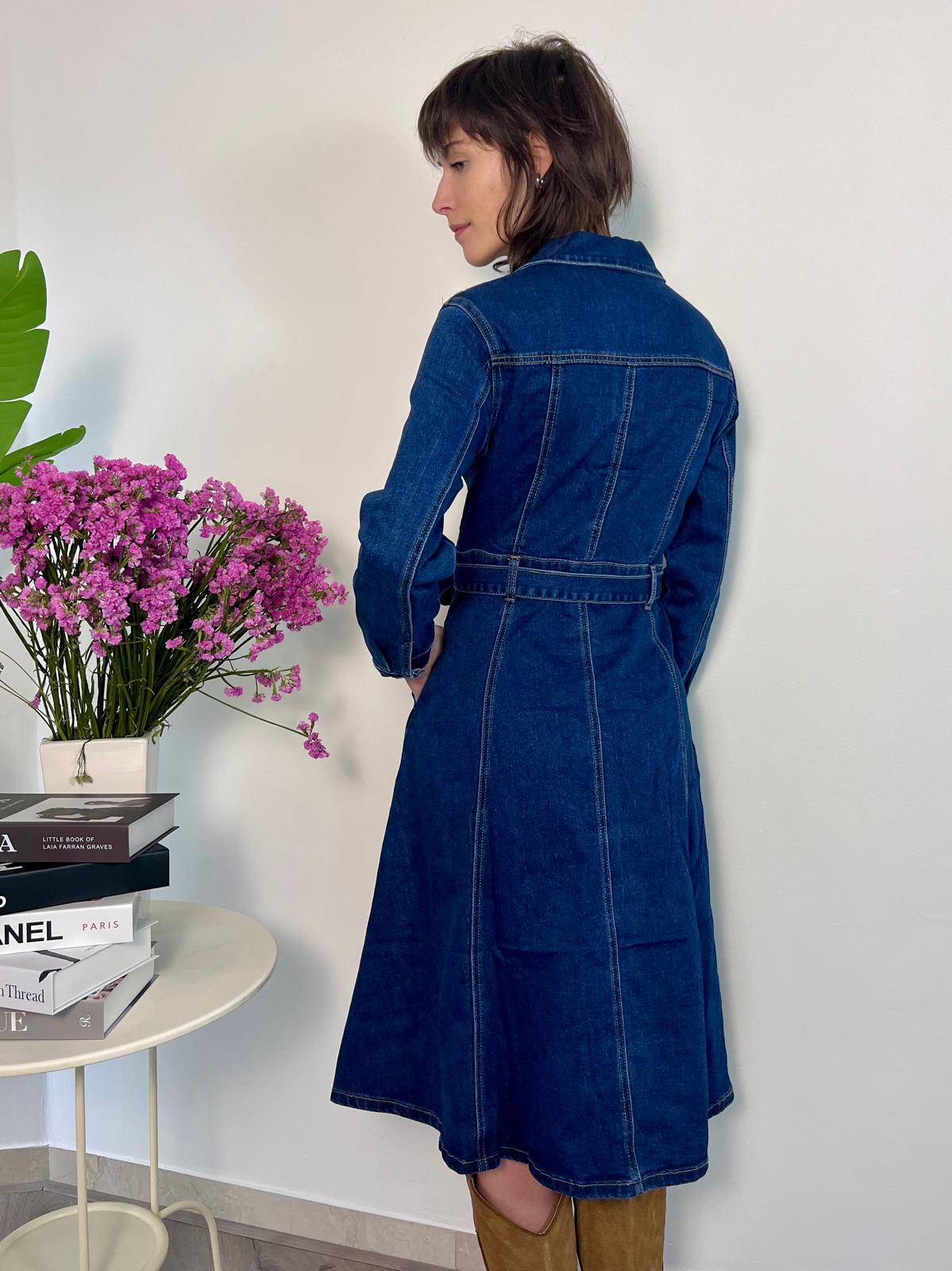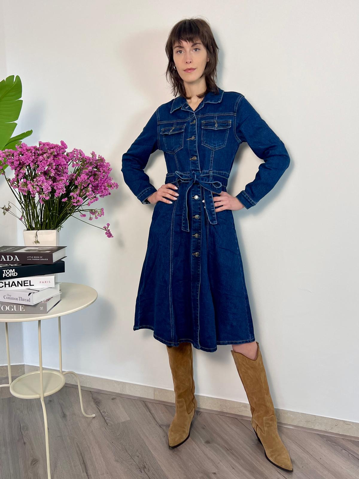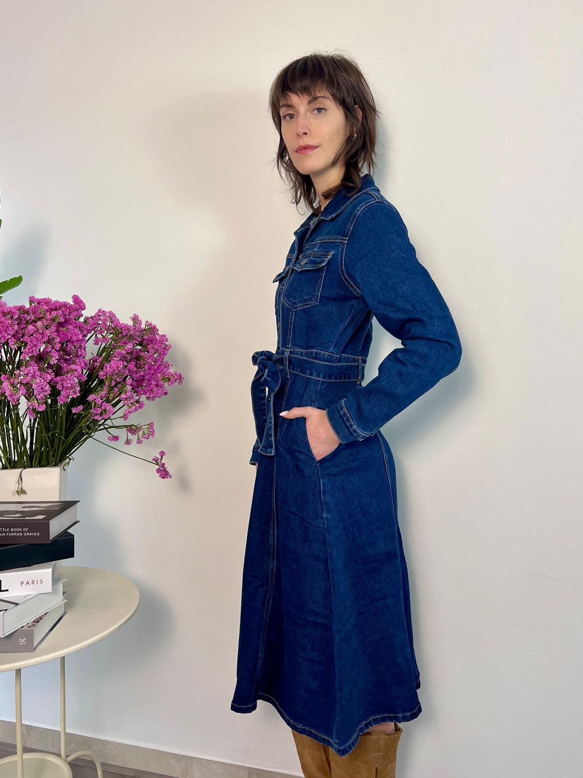 Abito midi in denim che unisce praticità e femminilità. Realizzato in denim morbido e confortevole, la linea leggermente svasata segue naturalmente i tuoi movimenti. La chiusura frontale con bottoni e la cintura in vita ti permettono di regolare la vestibilità e valorizzare la silhouette. Le tasche applicate e il taglio utility lo rendono incredibilmente versatile: indossalo con stivali per un look sofisticato, con sneakers per il quotidiano, o con anfibi per un tocco più audace. Un capo senza tempo che diventa subito un essenziale del tuo guardaroba. Disponibile in S e M.