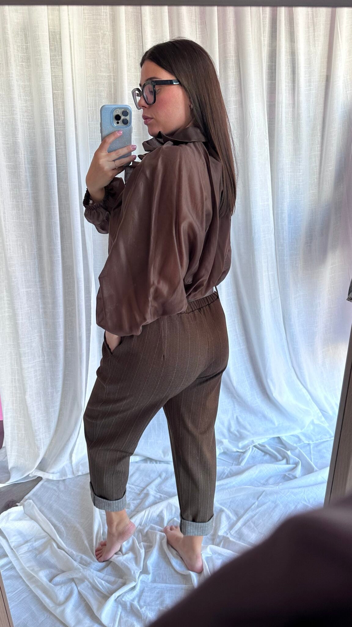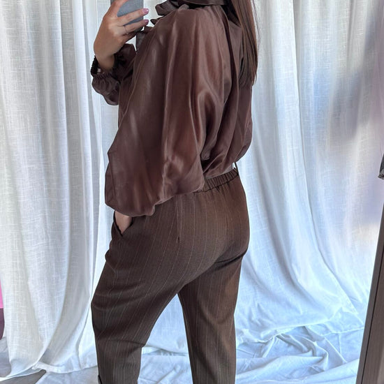 Questa blusa con laccio arricciato al collo è elegante e sofisticata, perfetta per ogni occasione. Taglia unica, consigliata per taglie 40-44, ha un elastico in vita che ti aiuterà a vestirla in modo comodo e perfetto. Aggiungi questo capo versatile e chic al tuo guardaroba oggi stesso!