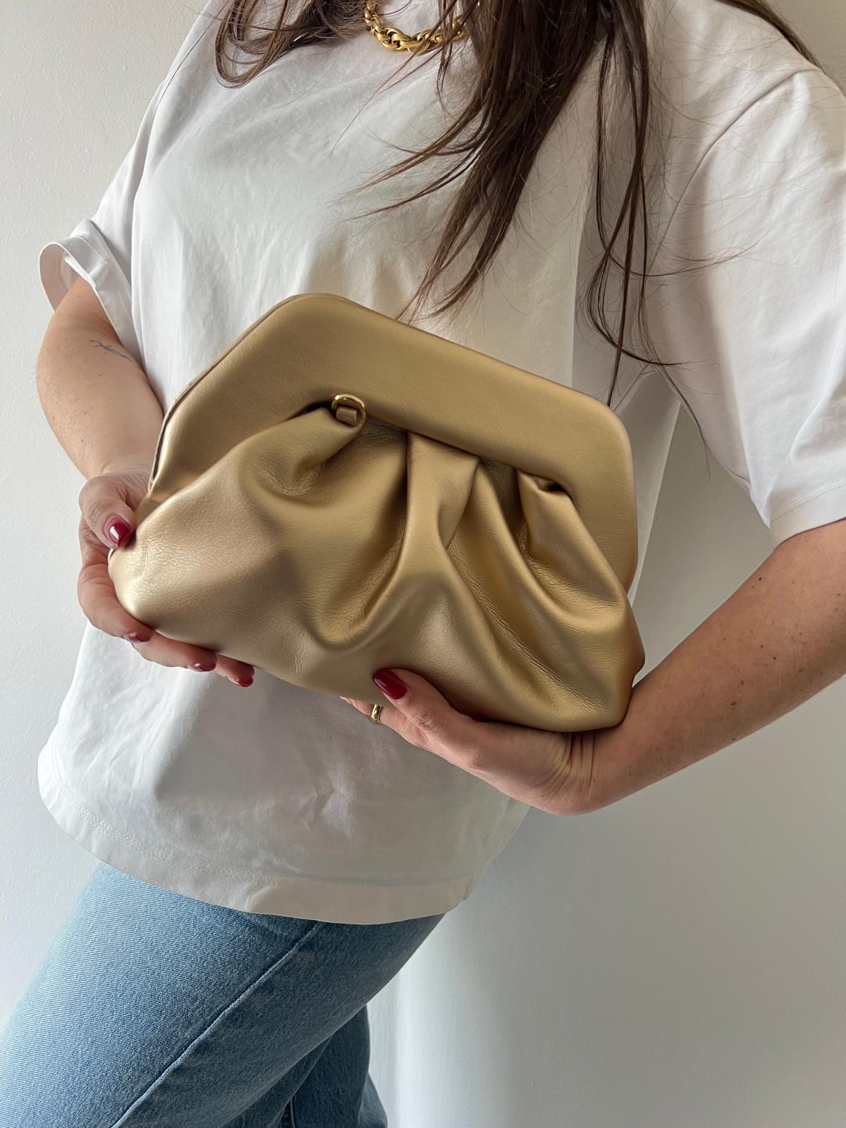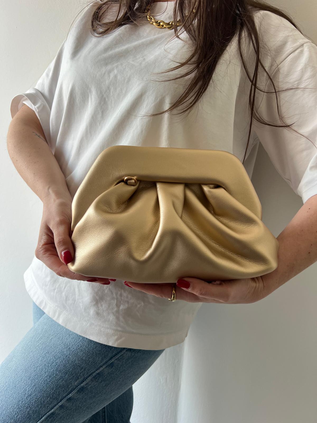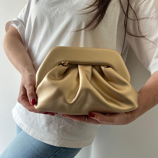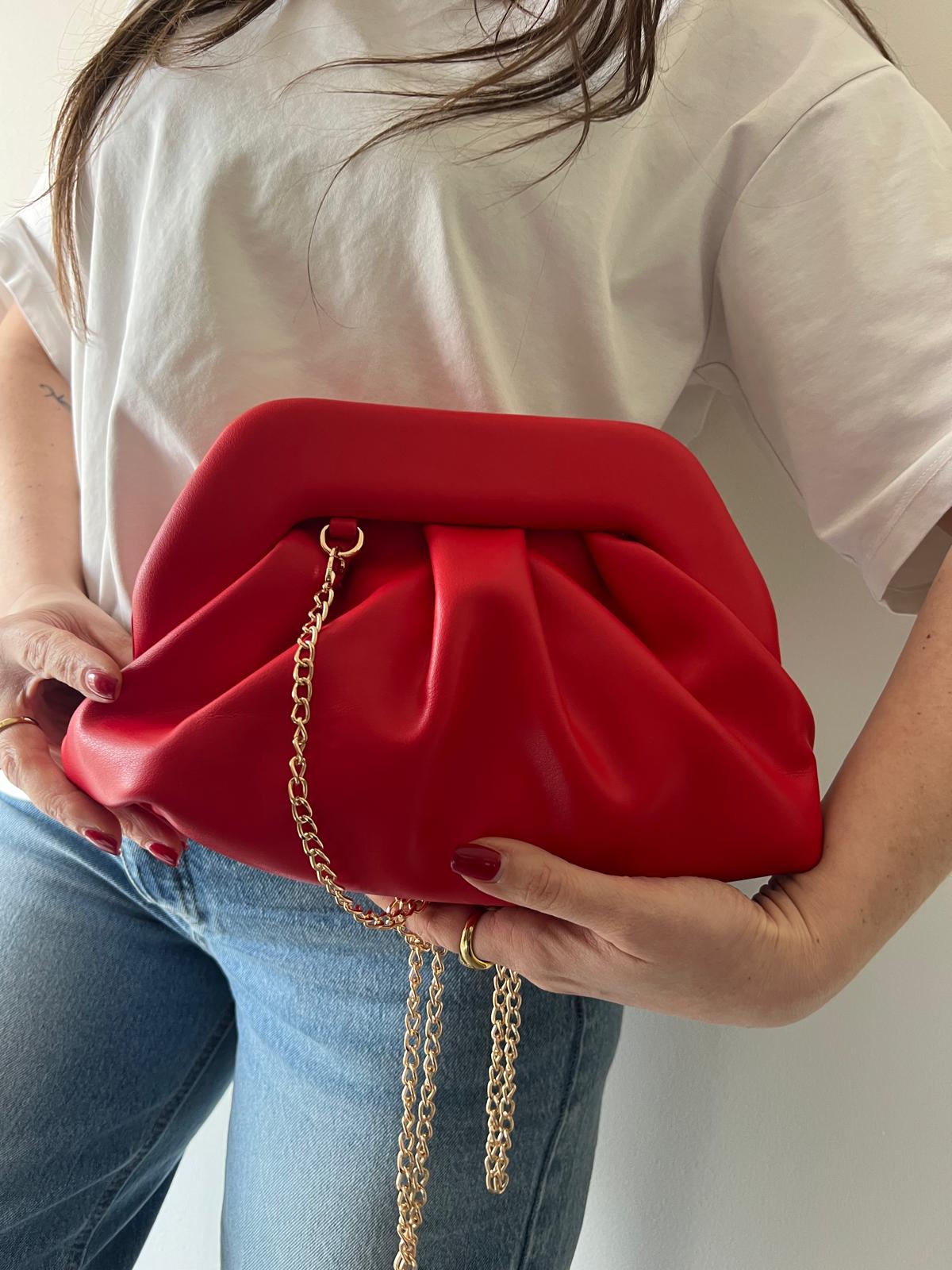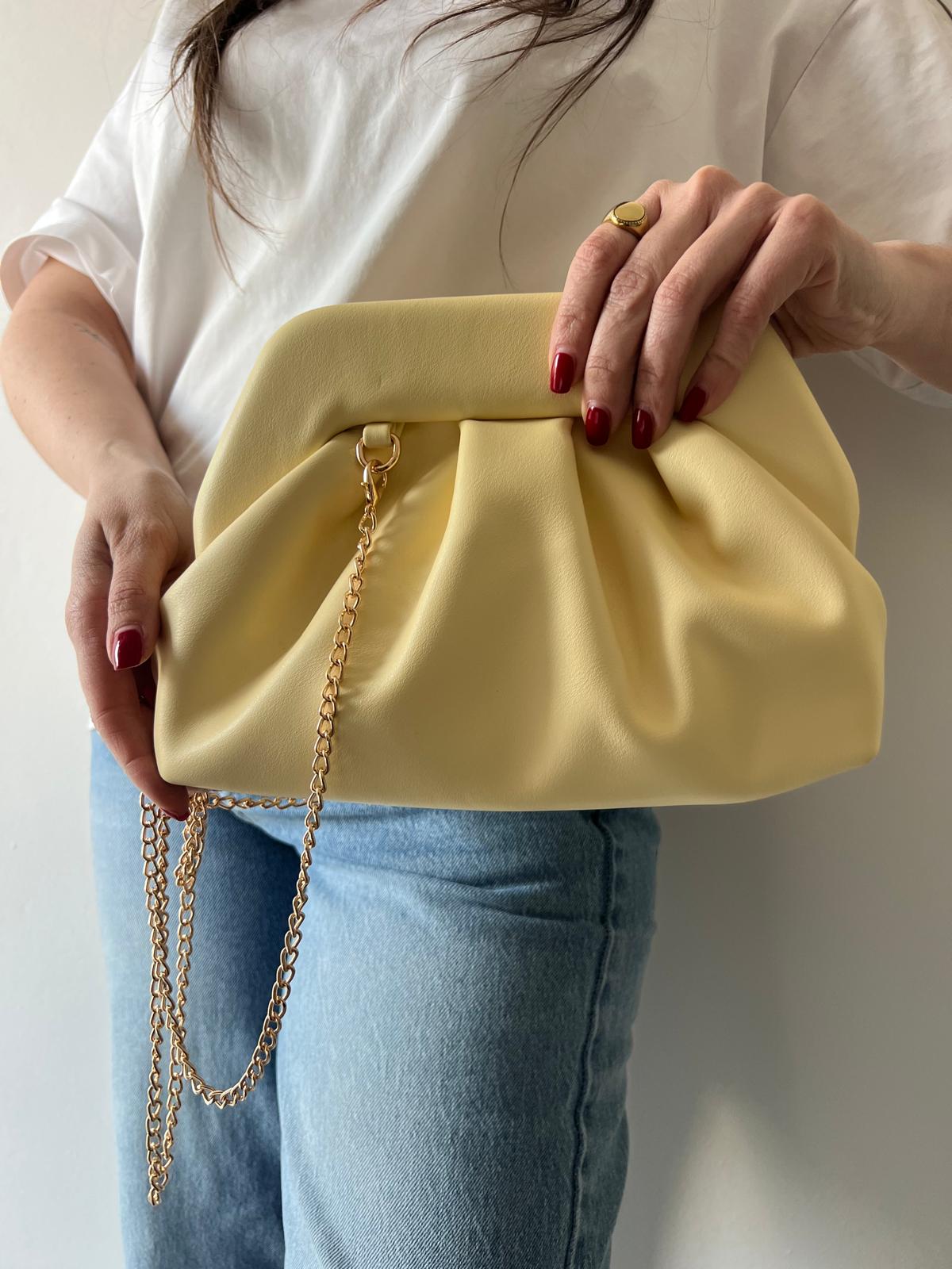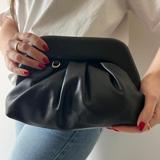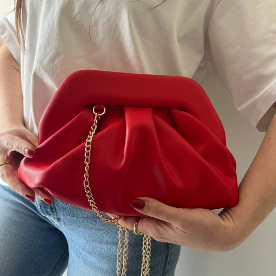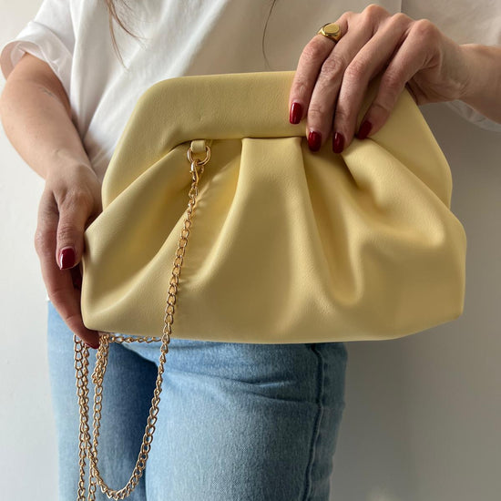 Borsa clutch dal design morbido e contemporaneo, caratterizzata da eleganti pieghe decorative che creano volume e movimento. La struttura soffice regala un effetto raffinato e moderno, perfetto per chi ricerca stile senza compromessi. La catena dorata removibile offre versatilità: indossala come clutch per occasioni speciali o aggancia la catena per trasformarla in una pratica borsa a spalla da portare ogni giorno. Un accessorio che si adatta al tuo stile, dalla sera al quotidiano.