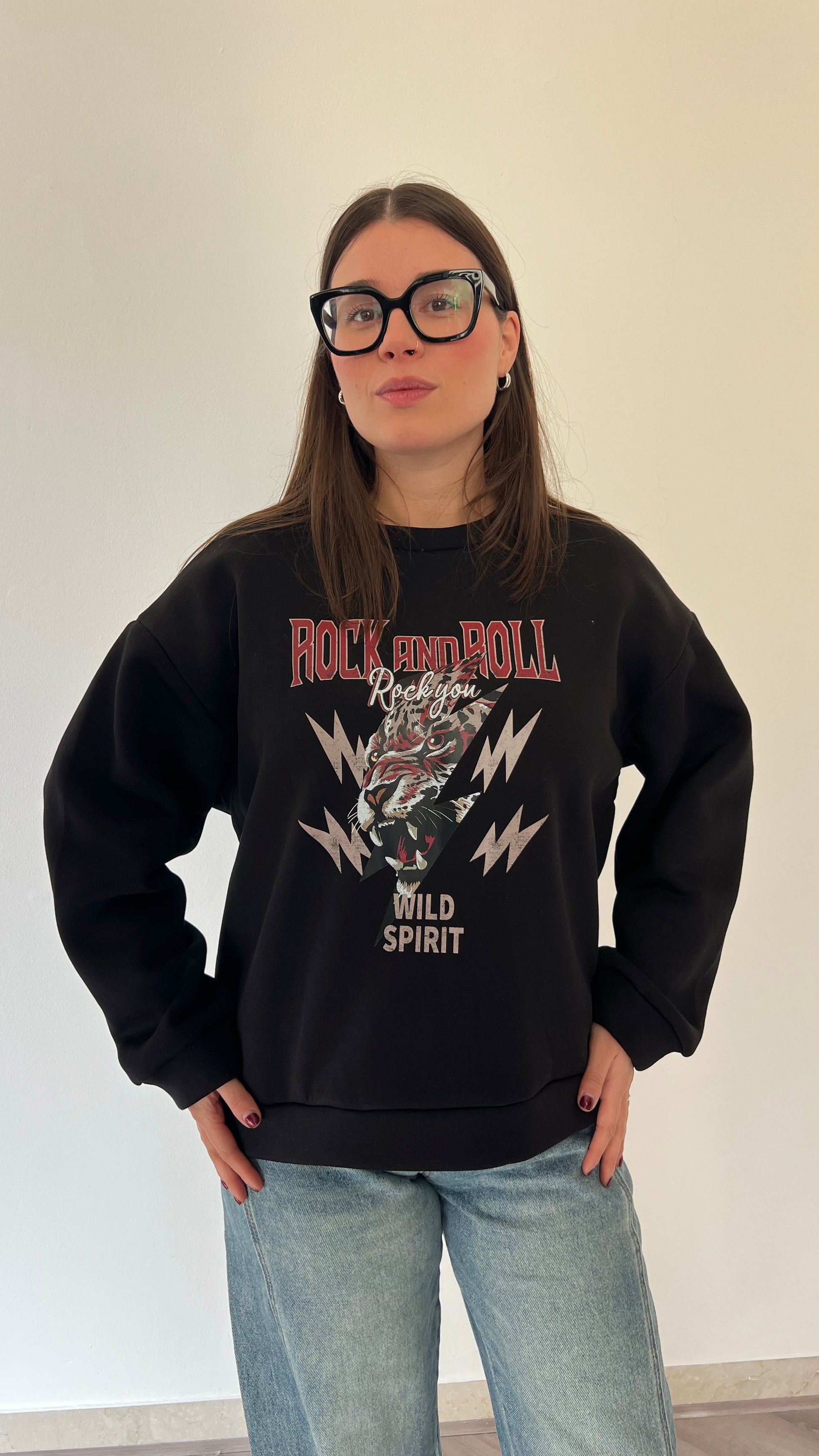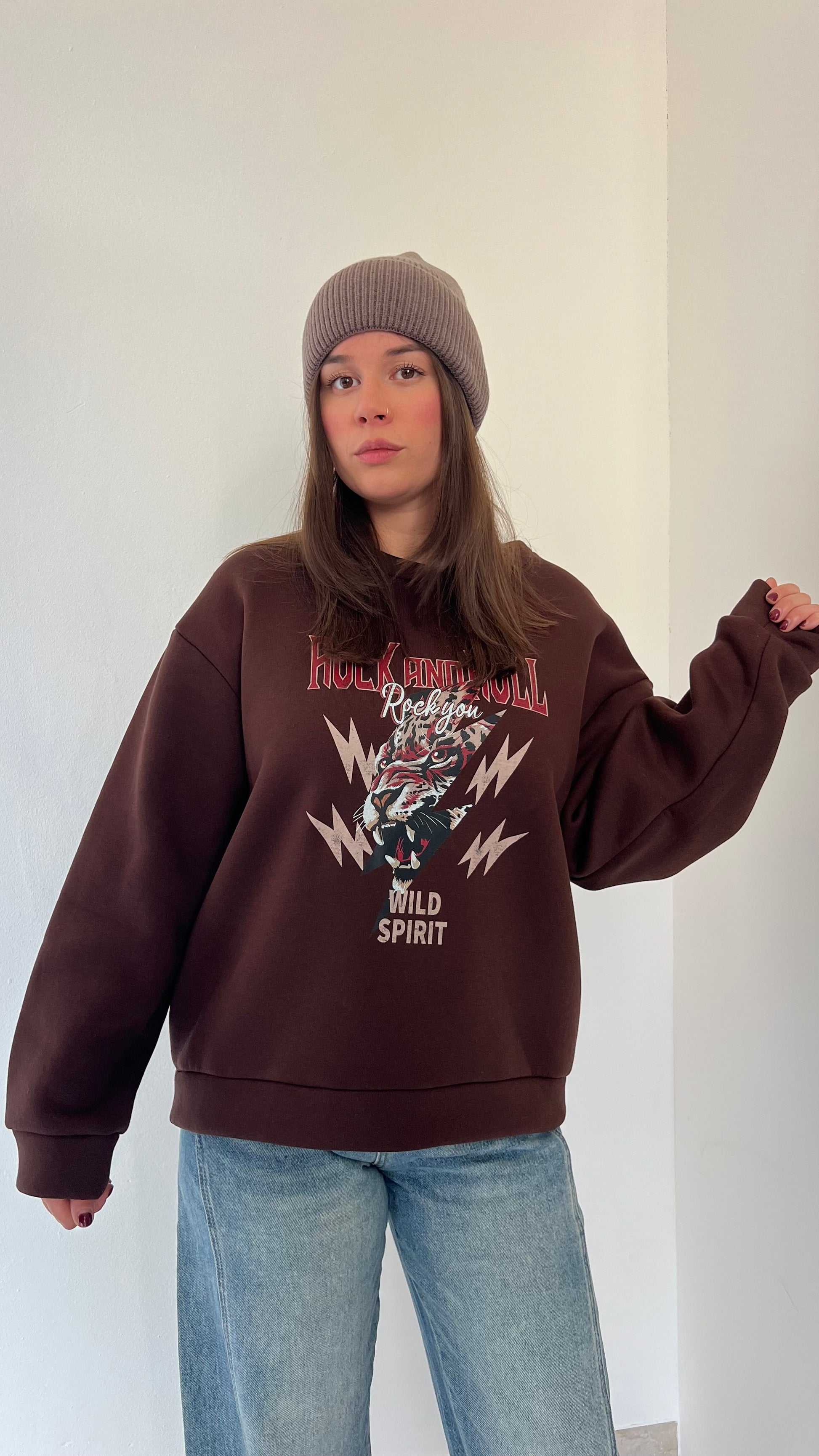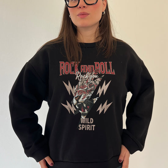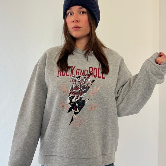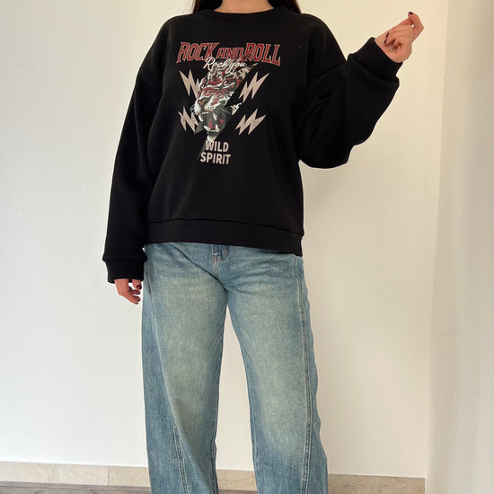 Felpa oversize in pile morbidissimo con stampa Rock and Roll dal carattere deciso. La struttura ampia e l'interno felpato garantiscono calore e comfort eccezionali, perfetta per i giorni più freddi. Taglia unica consigliata per chi indossa dalla 38 alla 46.