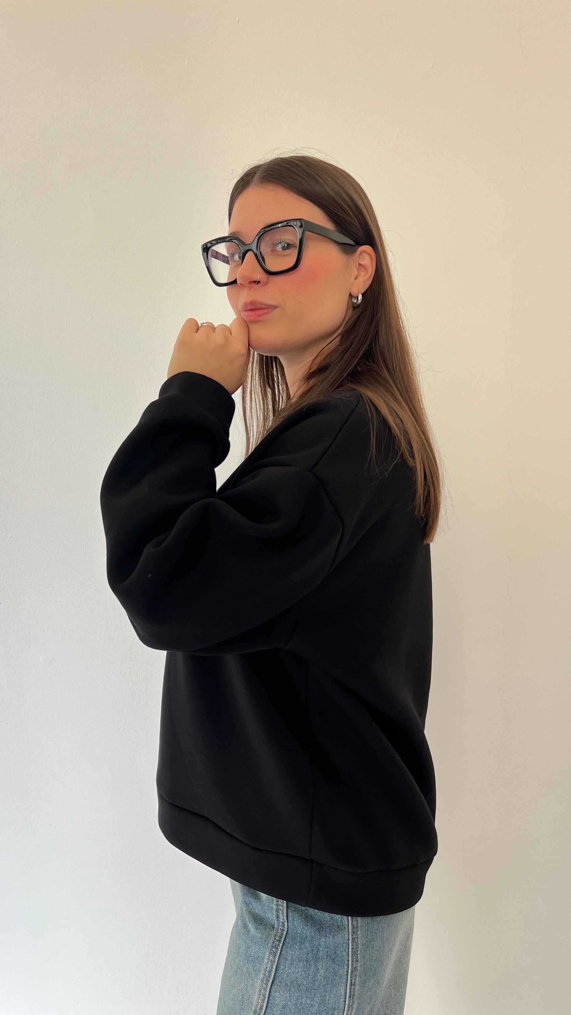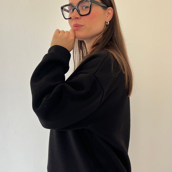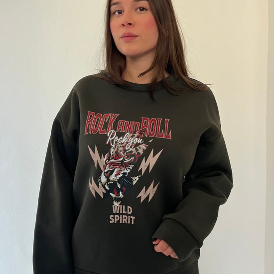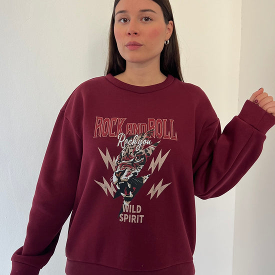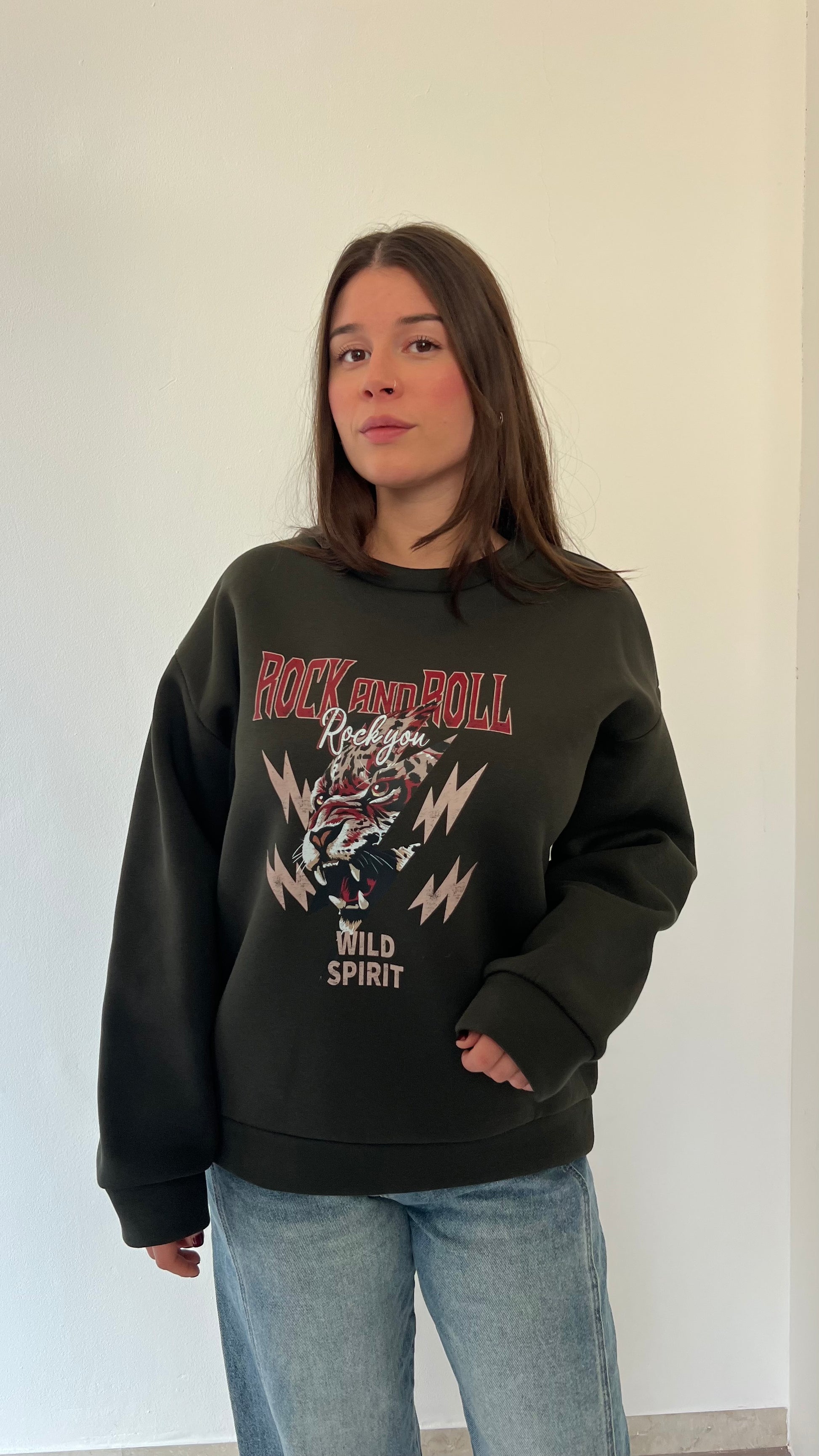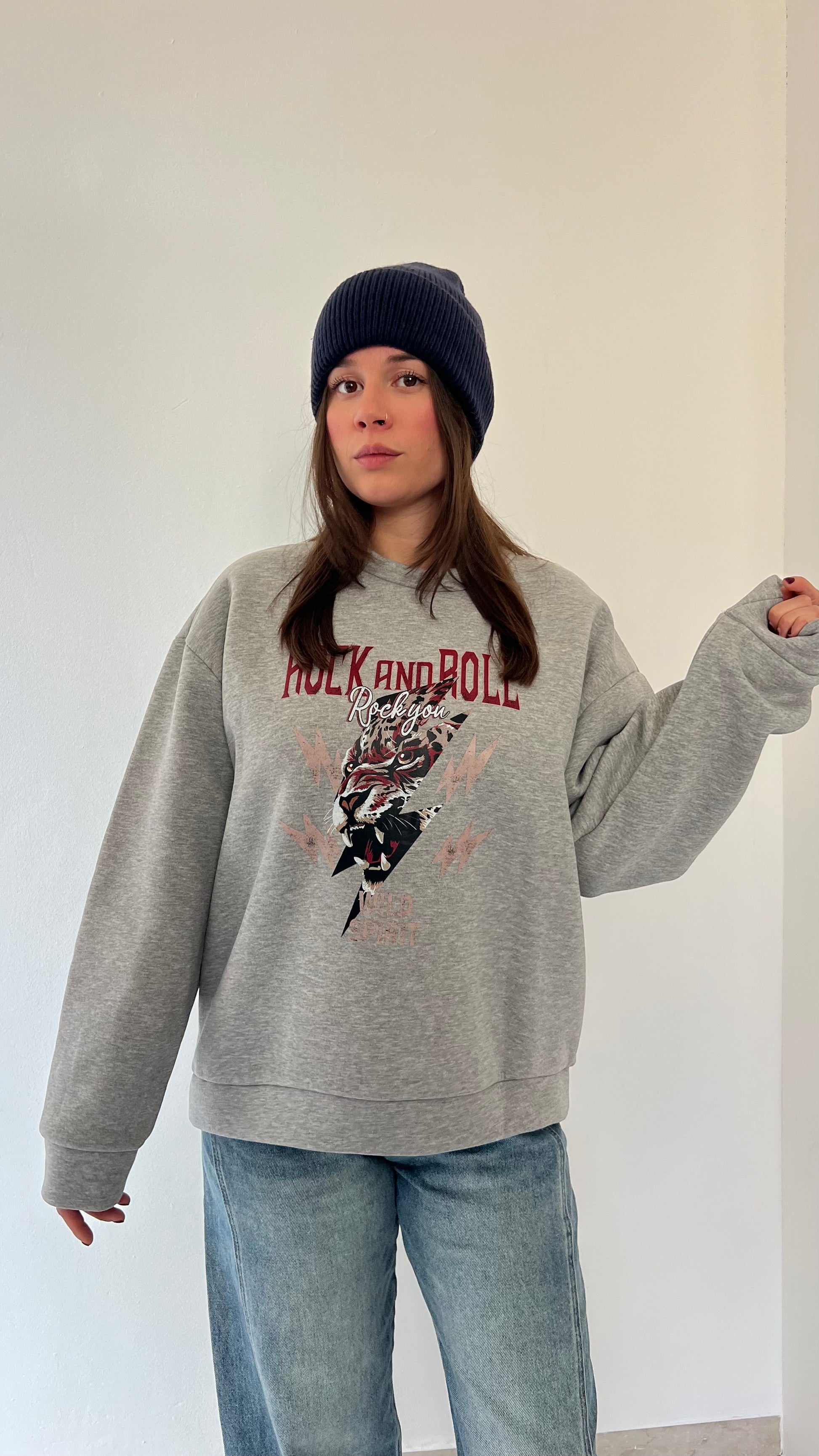 Felpa oversize in pile morbidissimo con stampa Rock and Roll dal carattere deciso. La struttura ampia e l'interno felpato garantiscono calore e comfort eccezionali, perfetta per i giorni più freddi. Taglia unica consigliata per chi indossa dalla 38 alla 46.