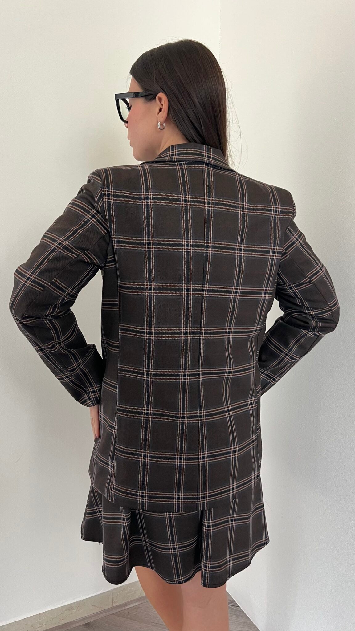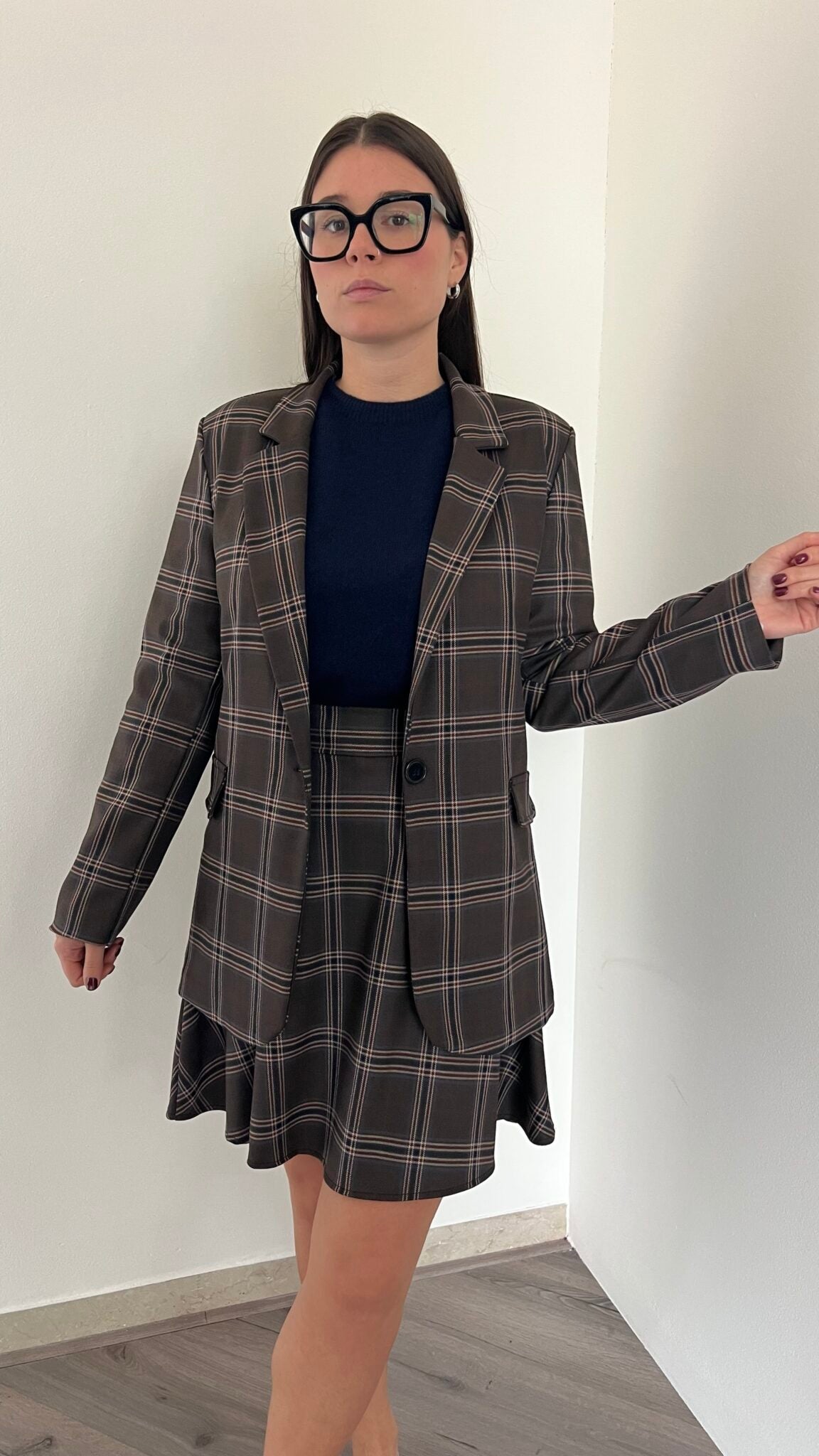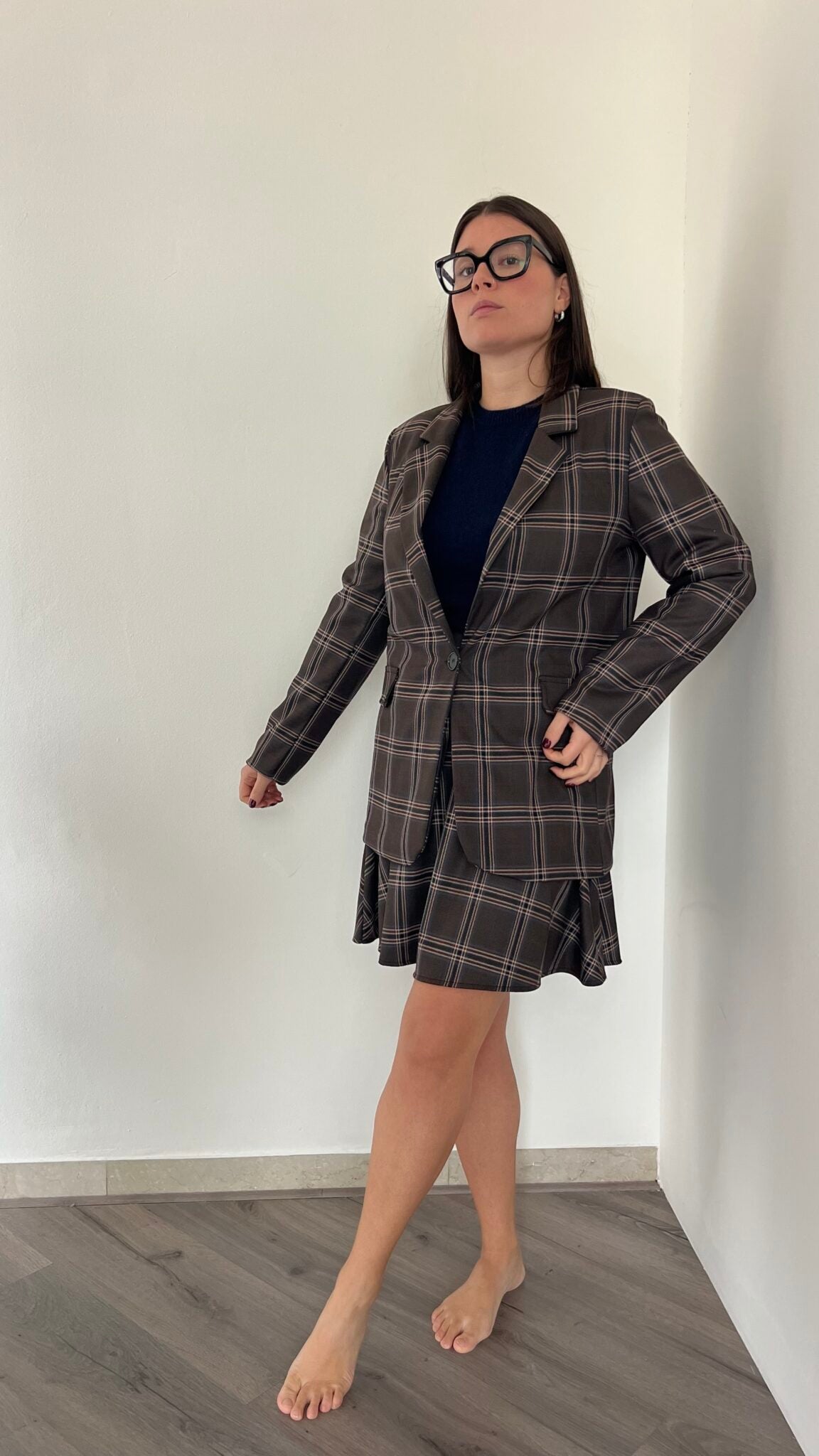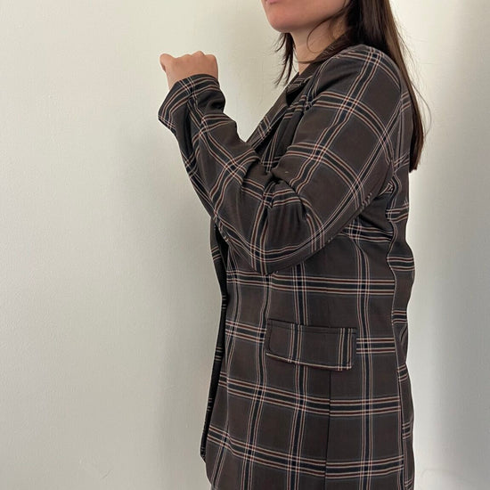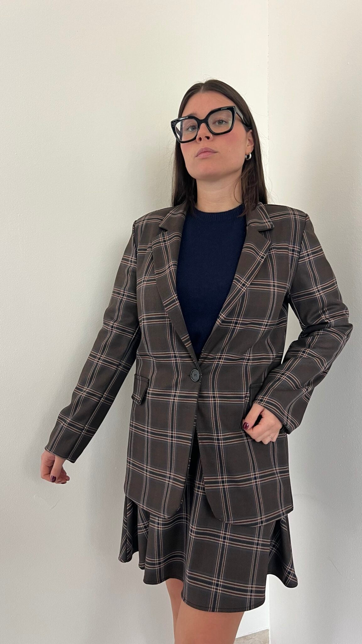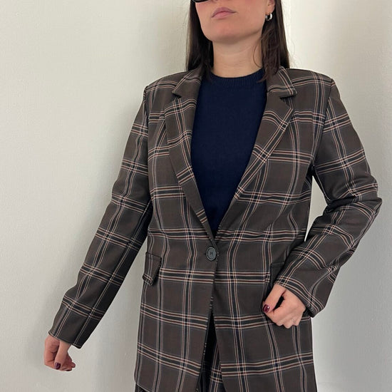 Giacca in taglia unica con taglio dritto e generoso, ideale dalle 40 alla 46. Caratterizzata da un'elegante fantasia check e chiusura con bottone singolo, offre una silhouette pulita e contemporanea. Un pezzo versatile che si presta a molteplici abbinamenti, perfetto per chi ricerca uno stile sobrio e raffinato.