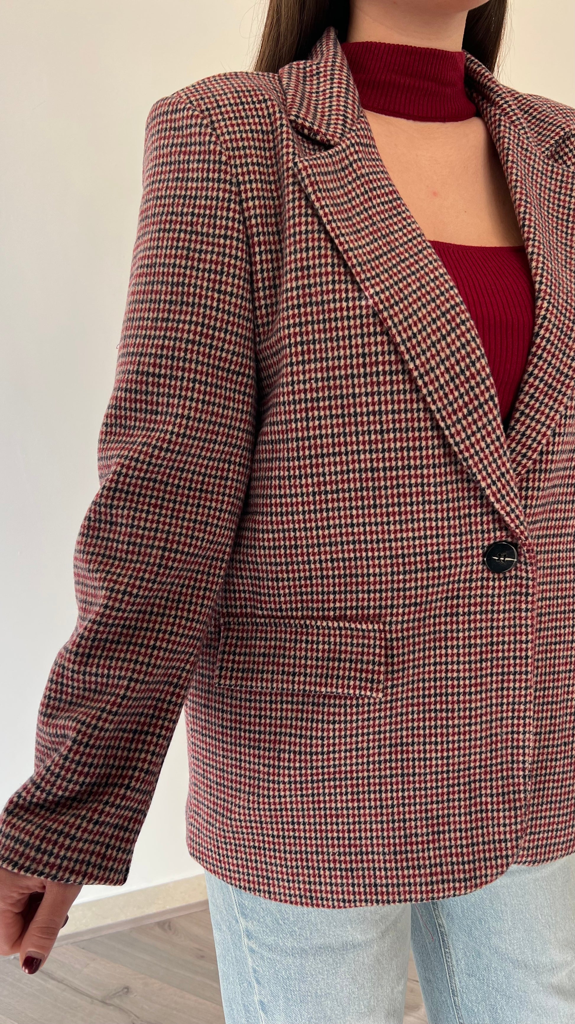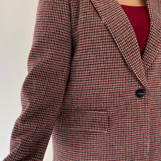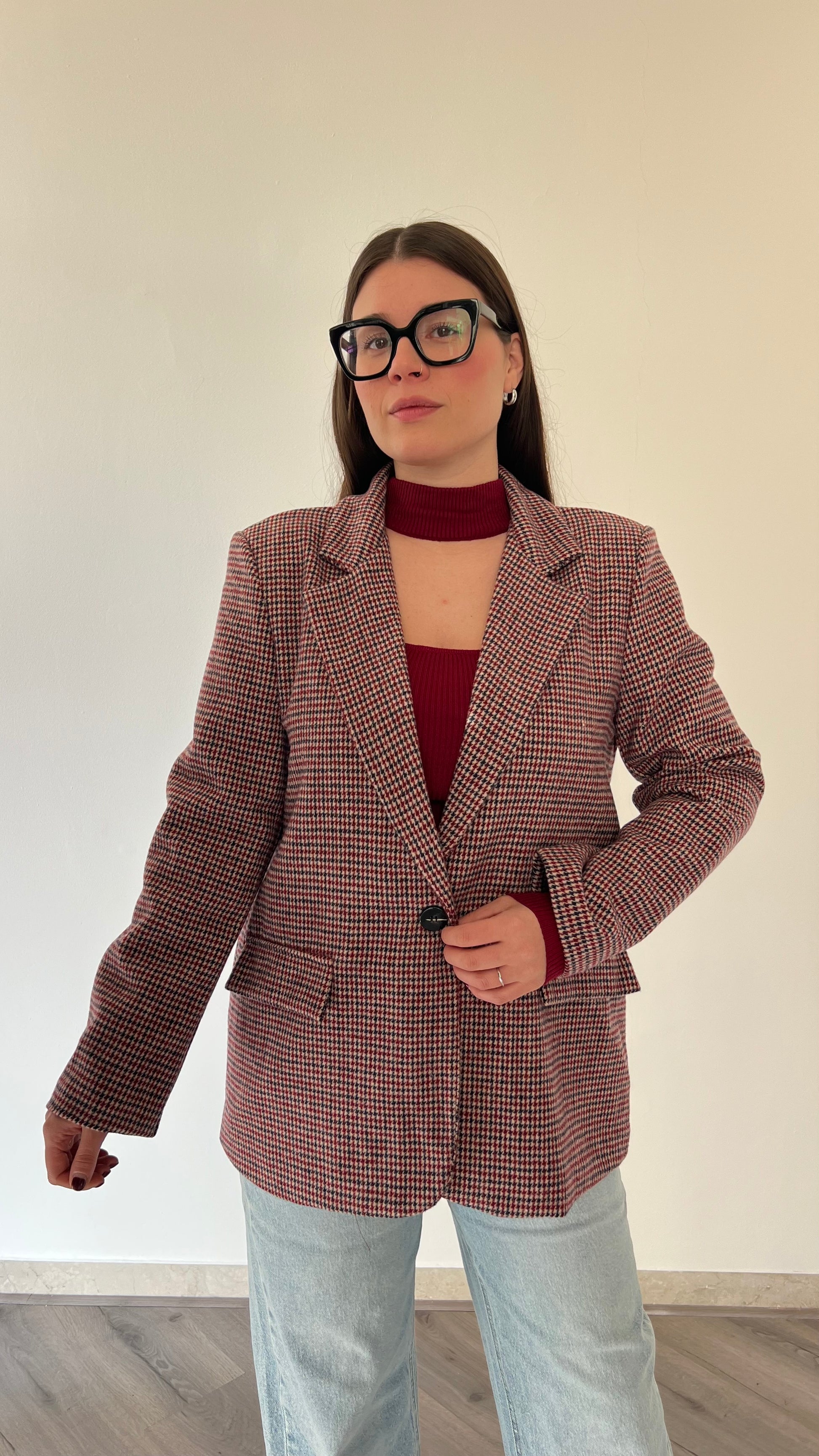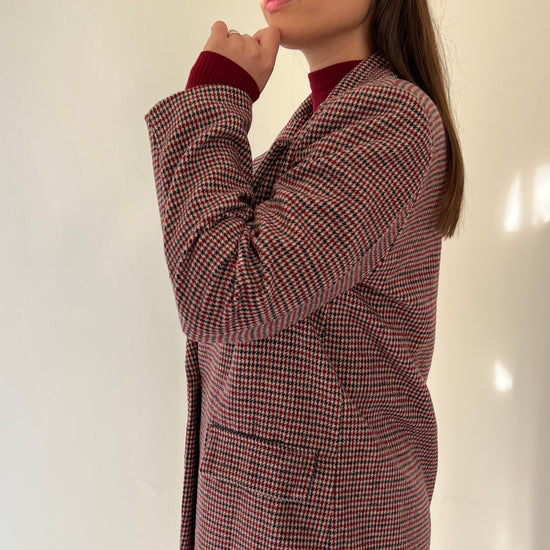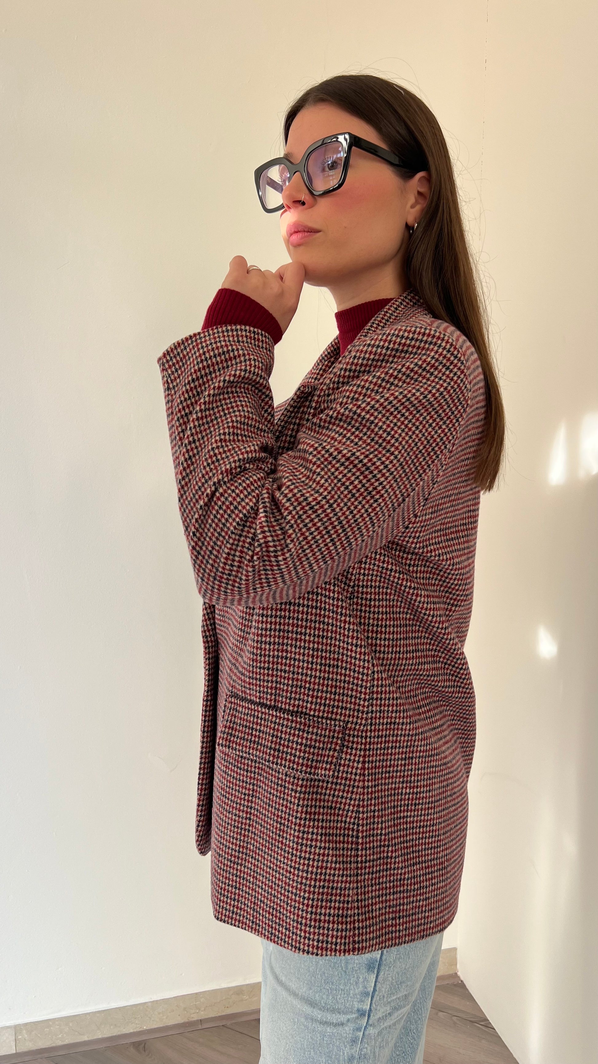 Giacca monopetto in tessuto flanellato con motivo pied de poule che combina borgogna, blu e beige in armonia cromatica. La texture morbida al tatto e il taglio classico la rendono un capo versatile per molteplici occasioni. Taglia unica consigliata per la 38-44.