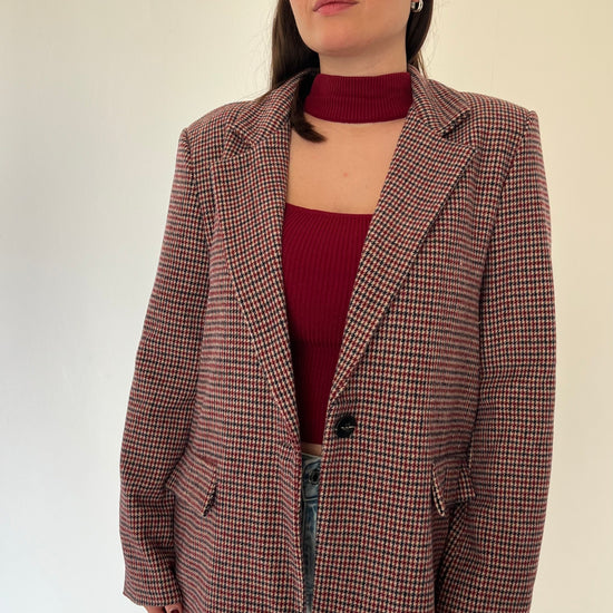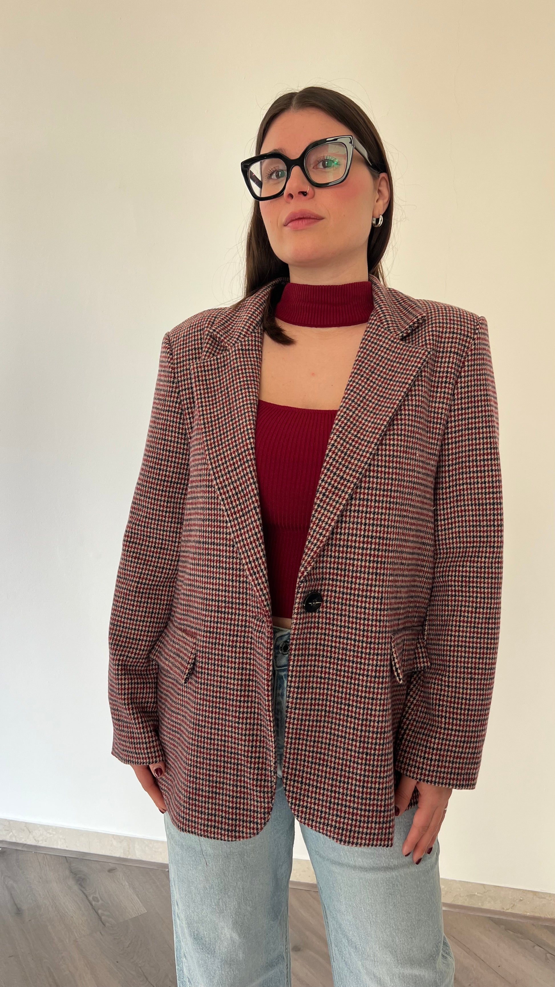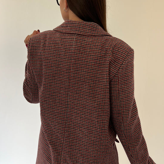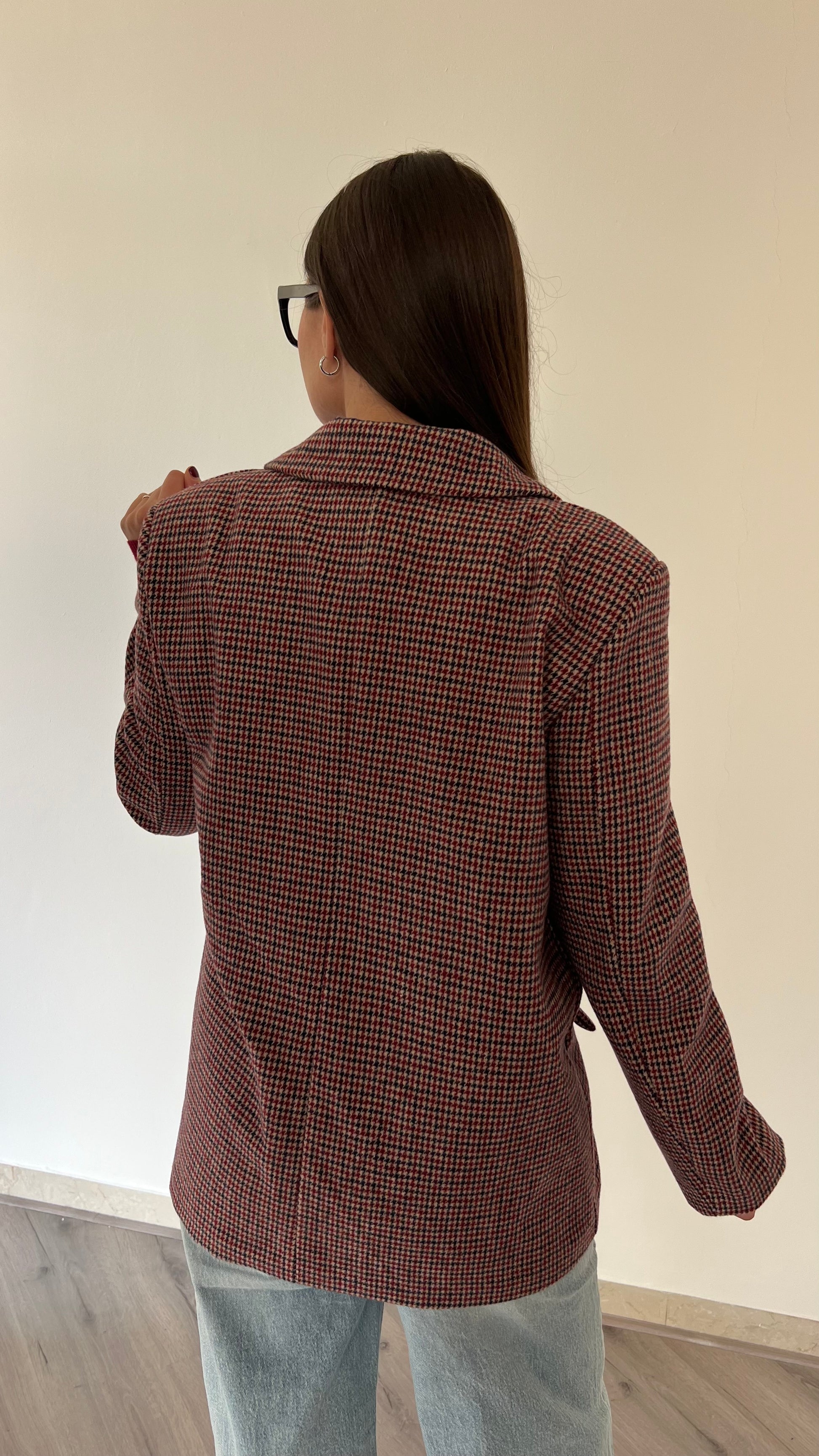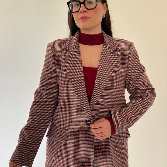 Giacca monopetto in tessuto flanellato con motivo pied de poule che combina borgogna, blu e beige in armonia cromatica. La texture morbida al tatto e il taglio classico la rendono un capo versatile per molteplici occasioni. Taglia unica consigliata per la 38-44.