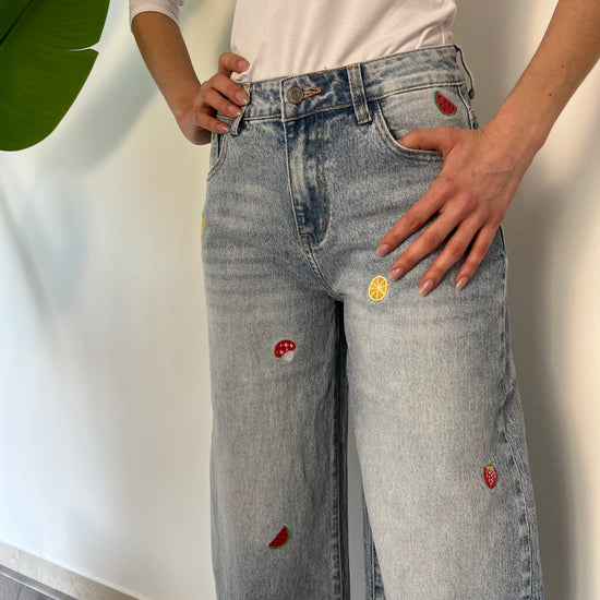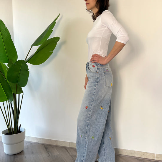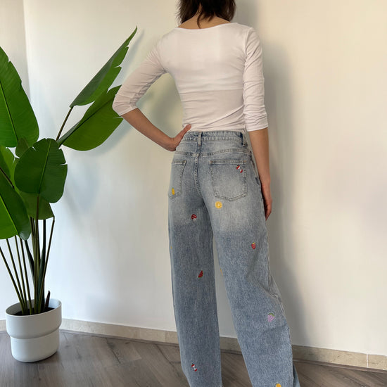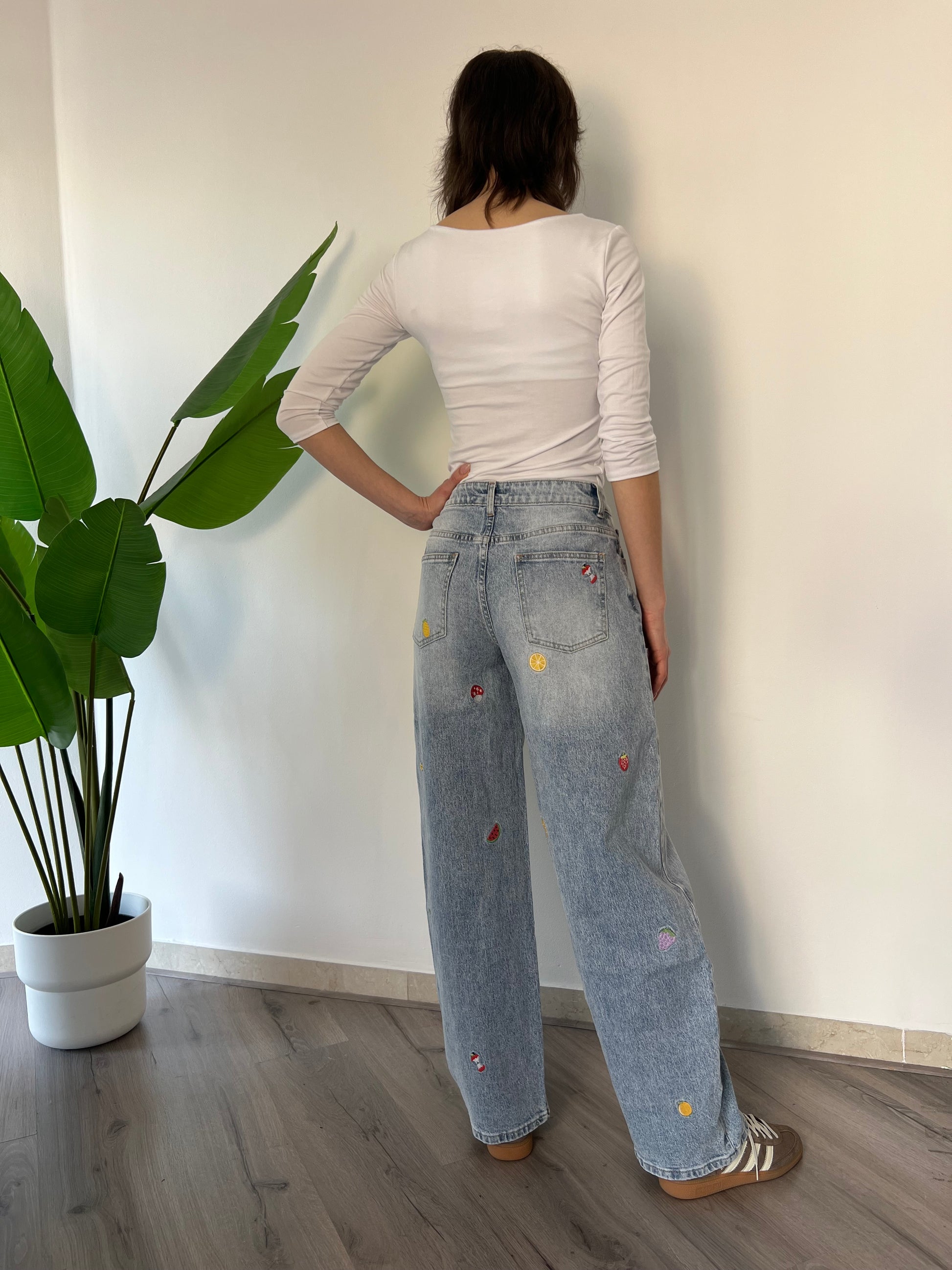 Porta l'estate nei tuoi pantaloni con i Jeans Barrel Summer Mood! Con la vita alta e quel pizzico di elasticità, sono come un abbraccio comodo per le tue curve. I ricami in cotone a tema fruttato aggiungono un tocco di freschezza al tuo outfit – un vero e proprio frullato di stile!