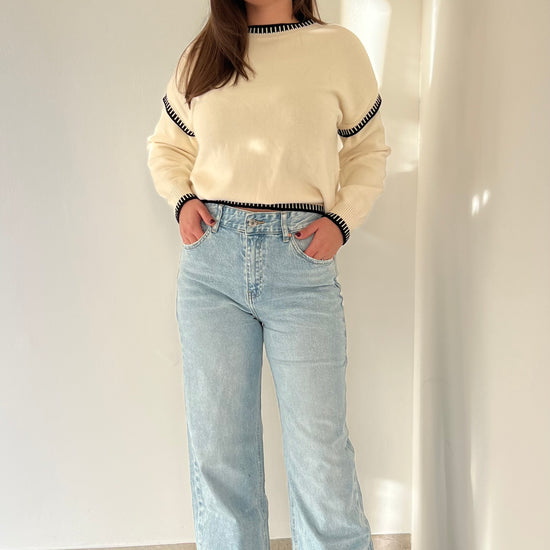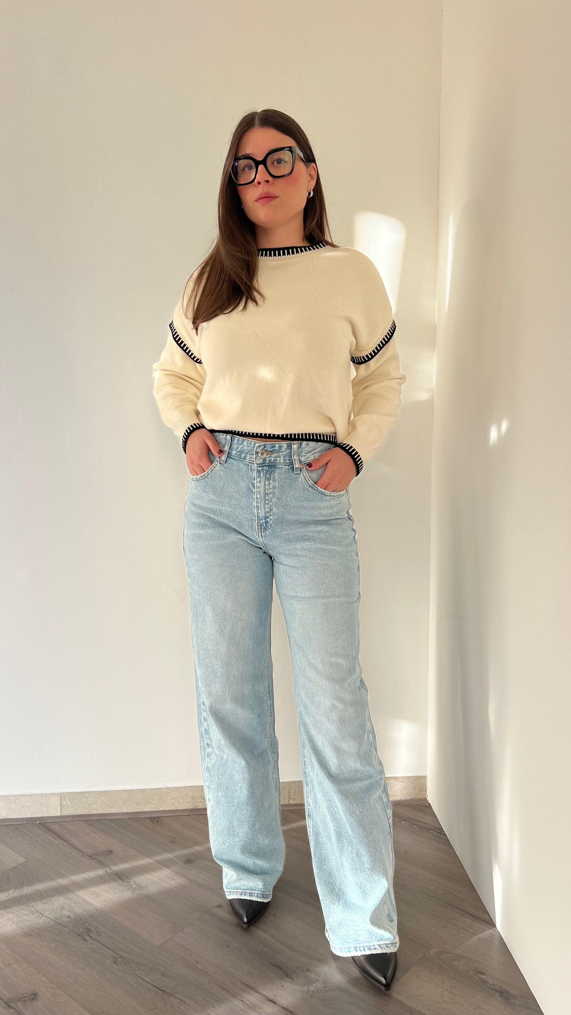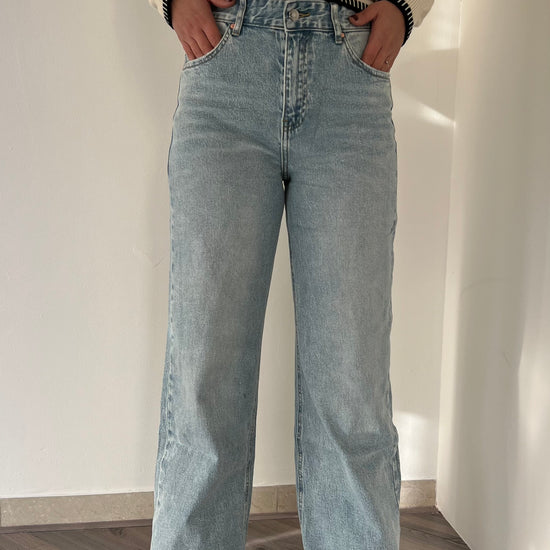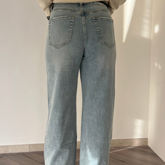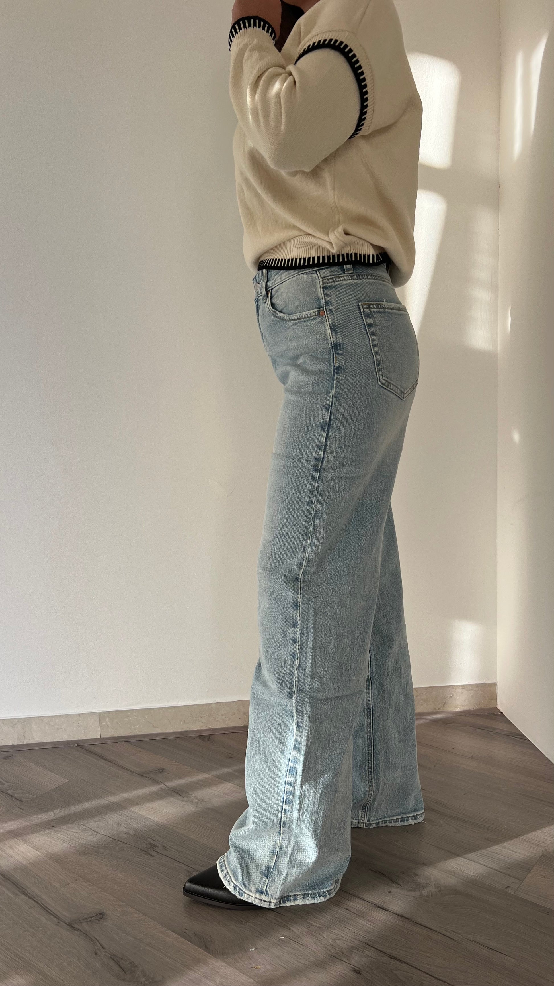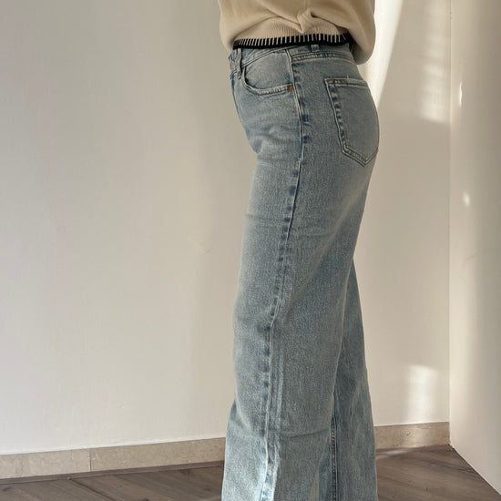 Jeans a gamba larga in cotone elasticizzato con vita alta, garantendo comfort e libertà di movimento. La vestibilità regolare segue fedelmente la taglia: XS(38), S(40), M(42), L(44). Perfetto per chi desidera un capo versatile e contemporaneo, come indossato nella foto dalla modella di 1,62 m in taglia M.