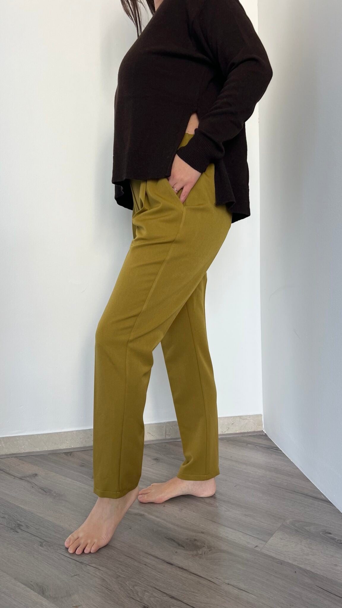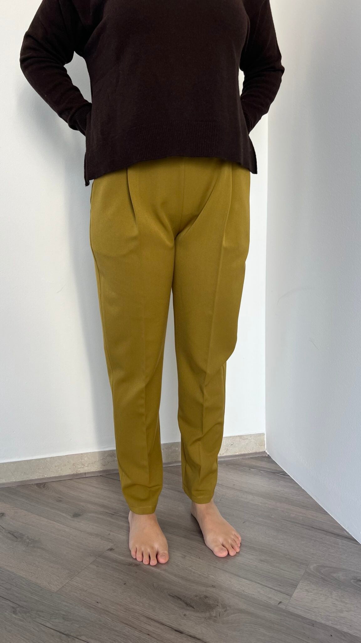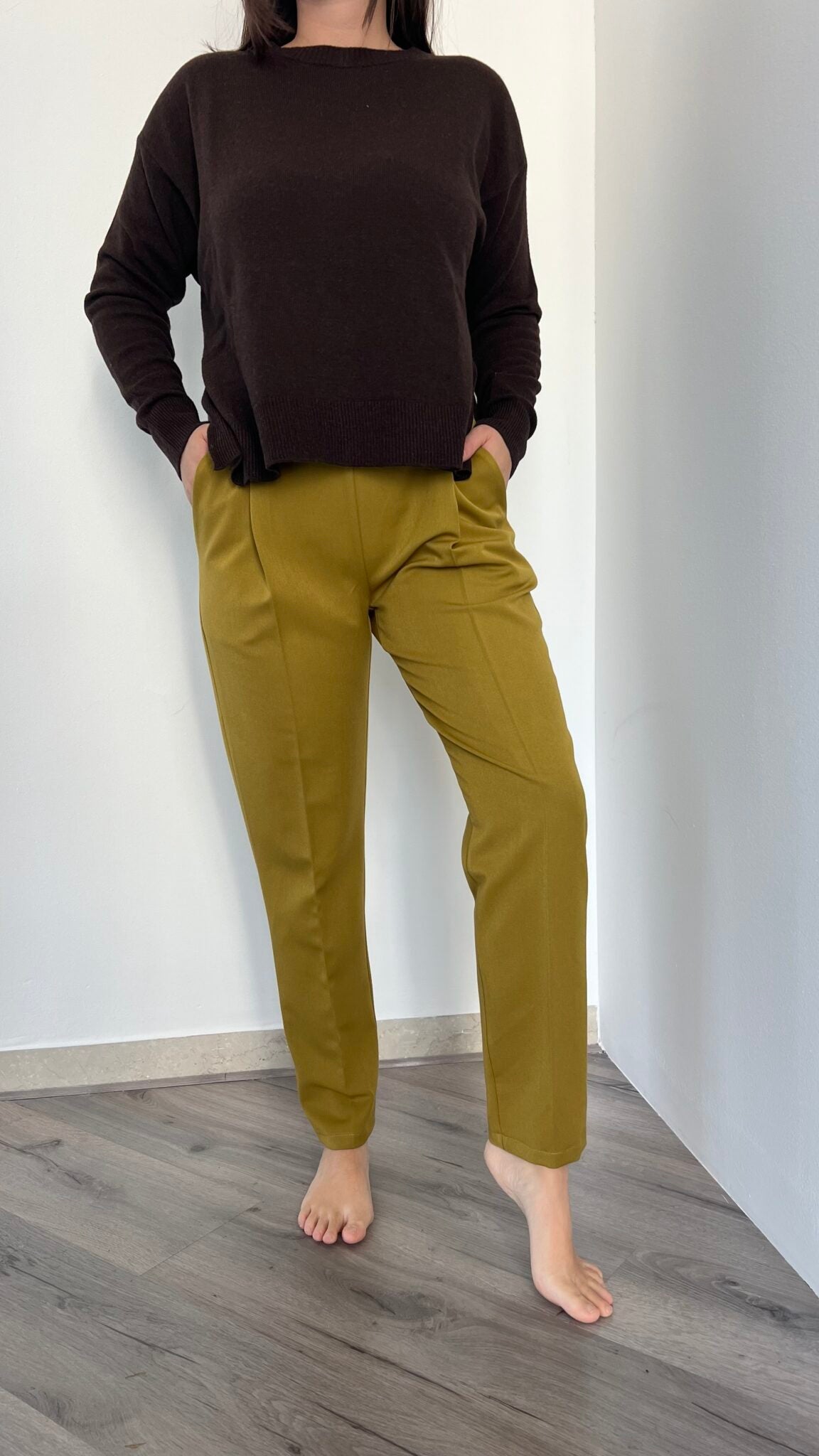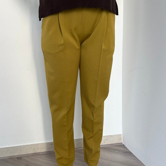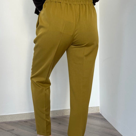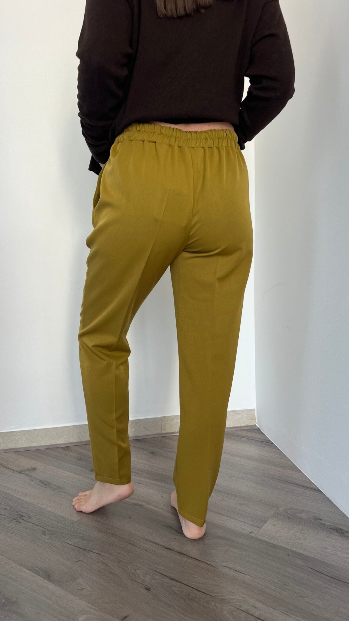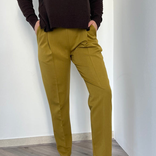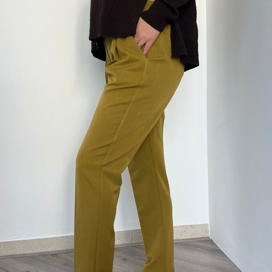 Jogger dritto nella sfumatura olio proposto nelle taglie S(40), M(42), L(44-46). La vita elasticizzata garantisce comfort senza compromessi, mentre la vestibilità avvolgente e distesa lo rende un capo essenziale per chi desidera praticità e stile in un'unica soluzione.