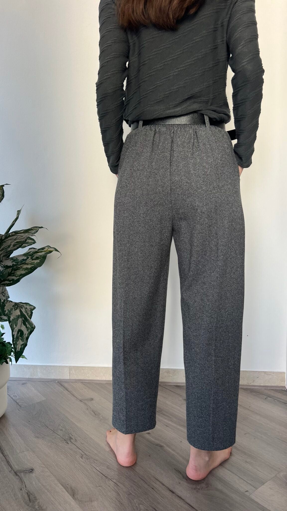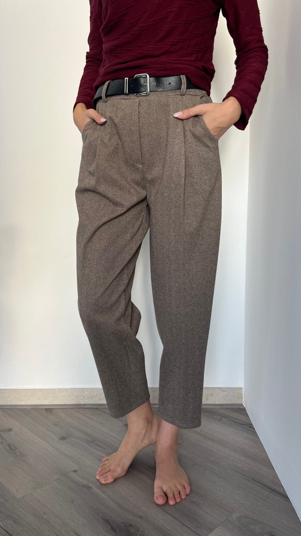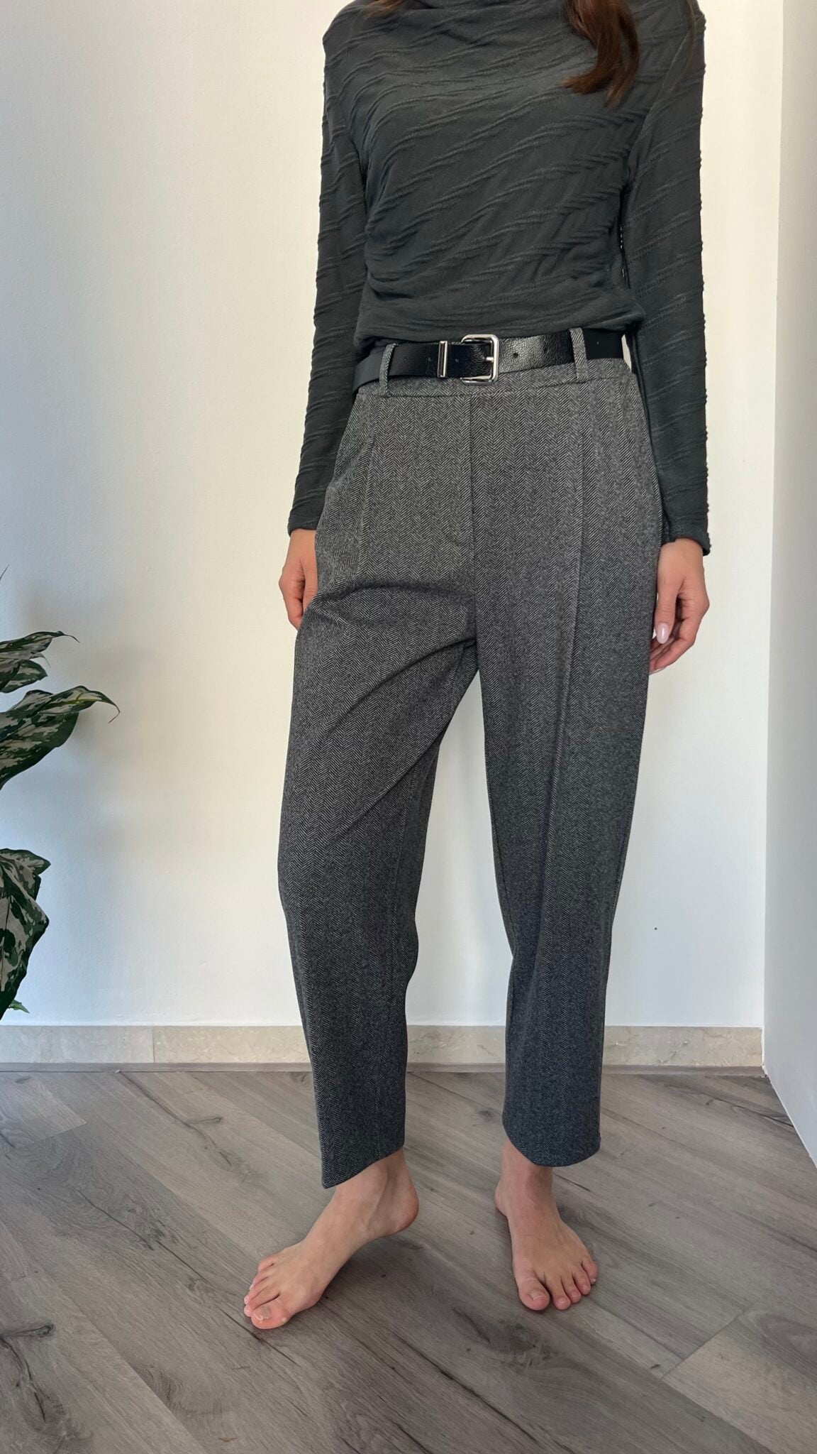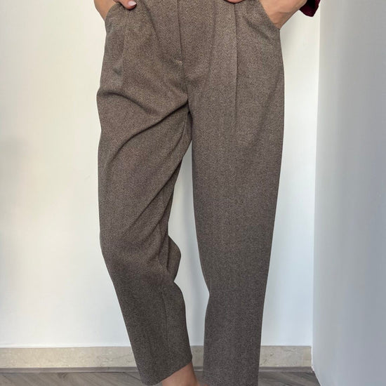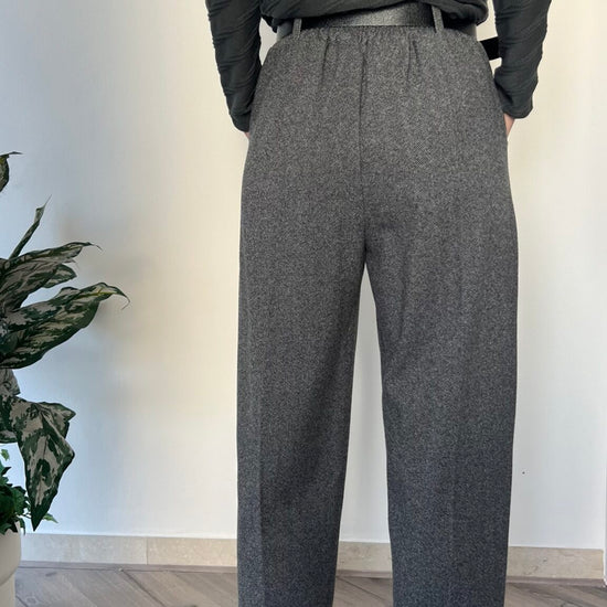 Jogger in fantasia spinata con vita elasticizzata e cintura abbinata fornita. Taglio unico pensato per le misure 40-44, offre comfort e libertà di movimento. Una scelta affidabile per chi privilegia funzionalità e semplicità nel proprio guardaroba.