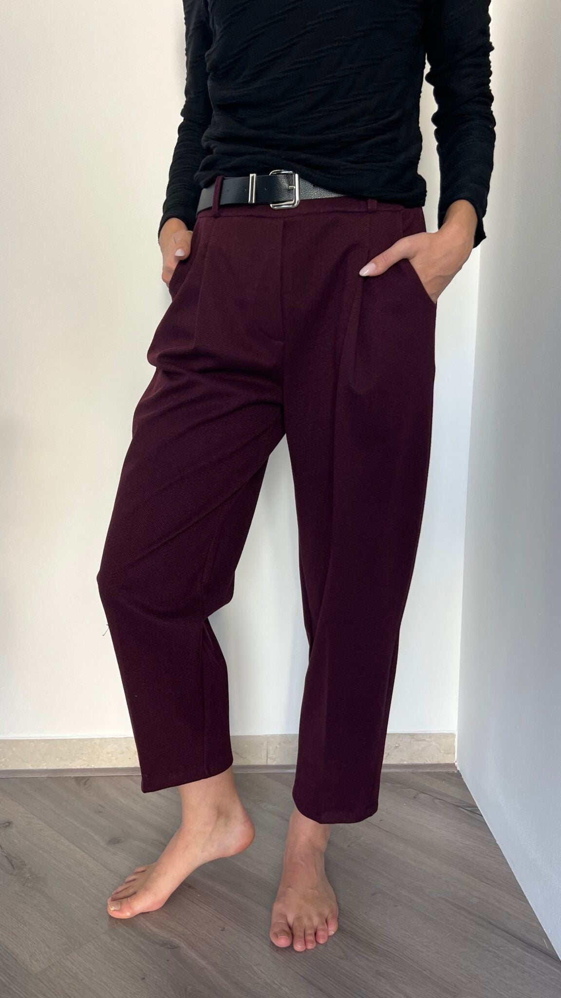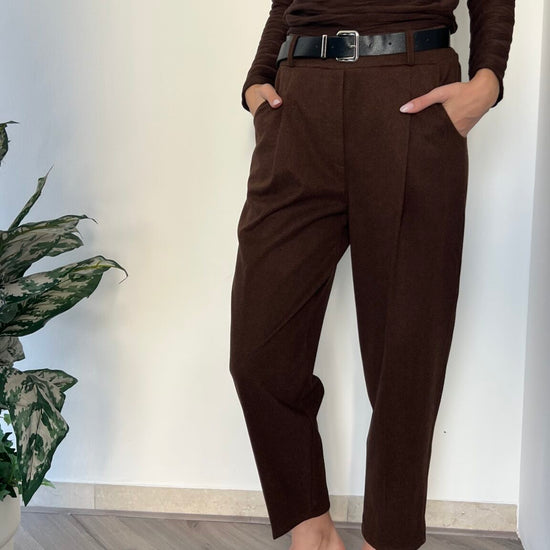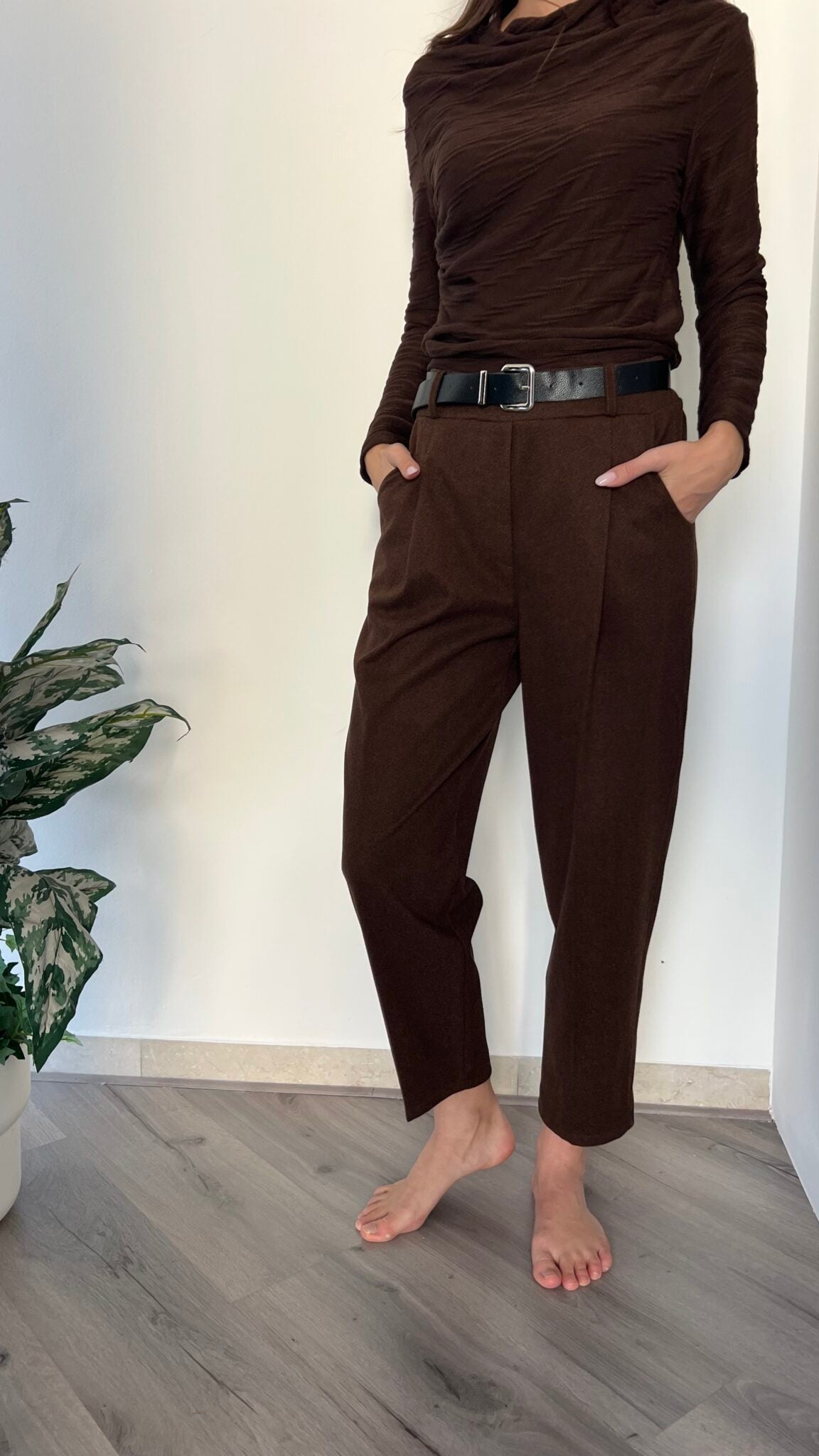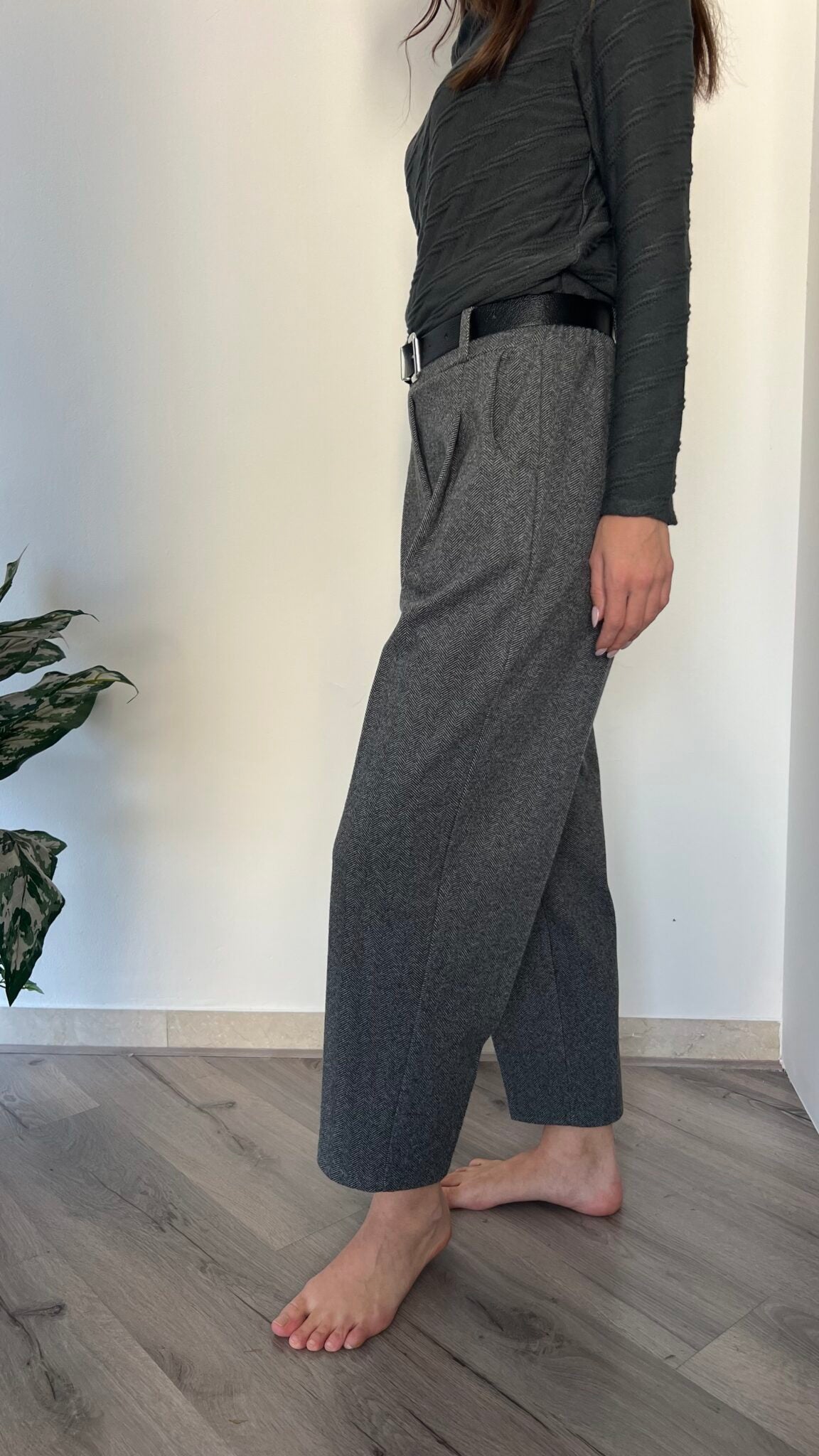 Jogger in fantasia spinata con vita elasticizzata e cintura abbinata fornita. Taglio unico pensato per le misure 40-44, offre comfort e libertà di movimento. Una scelta affidabile per chi privilegia funzionalità e semplicità nel proprio guardaroba.