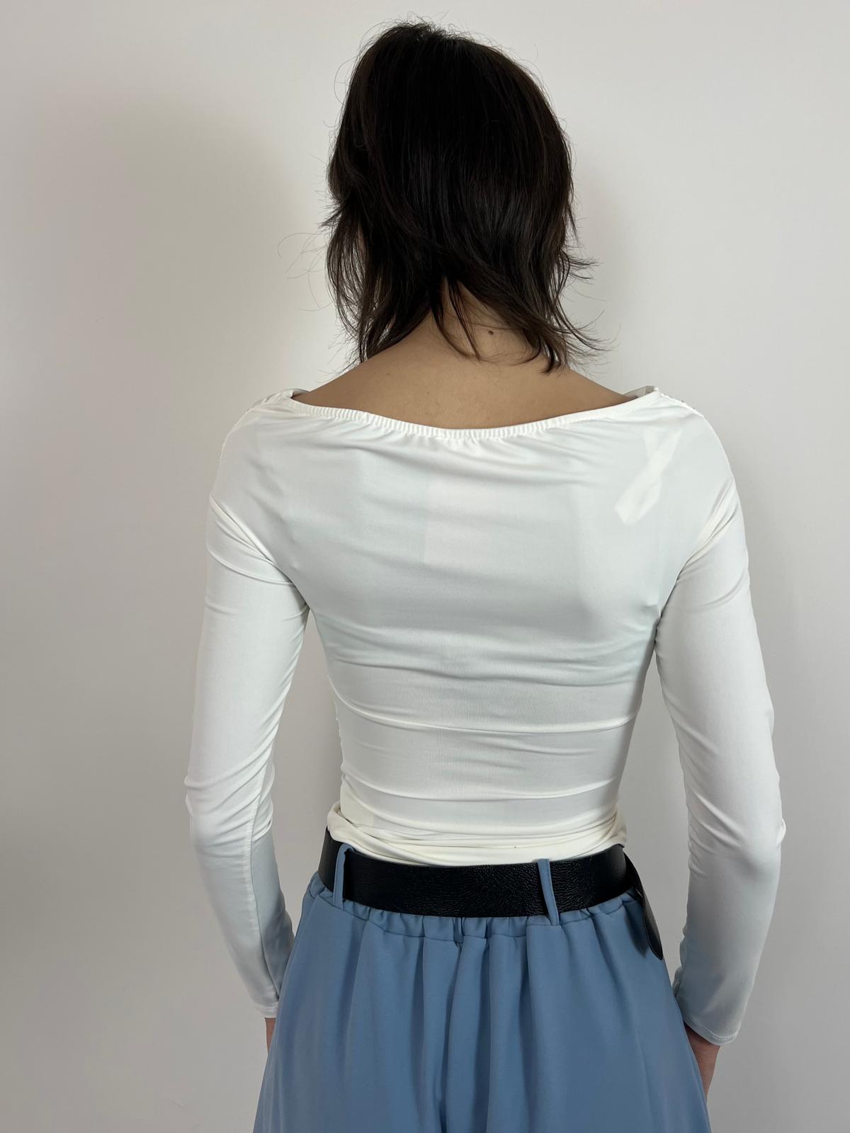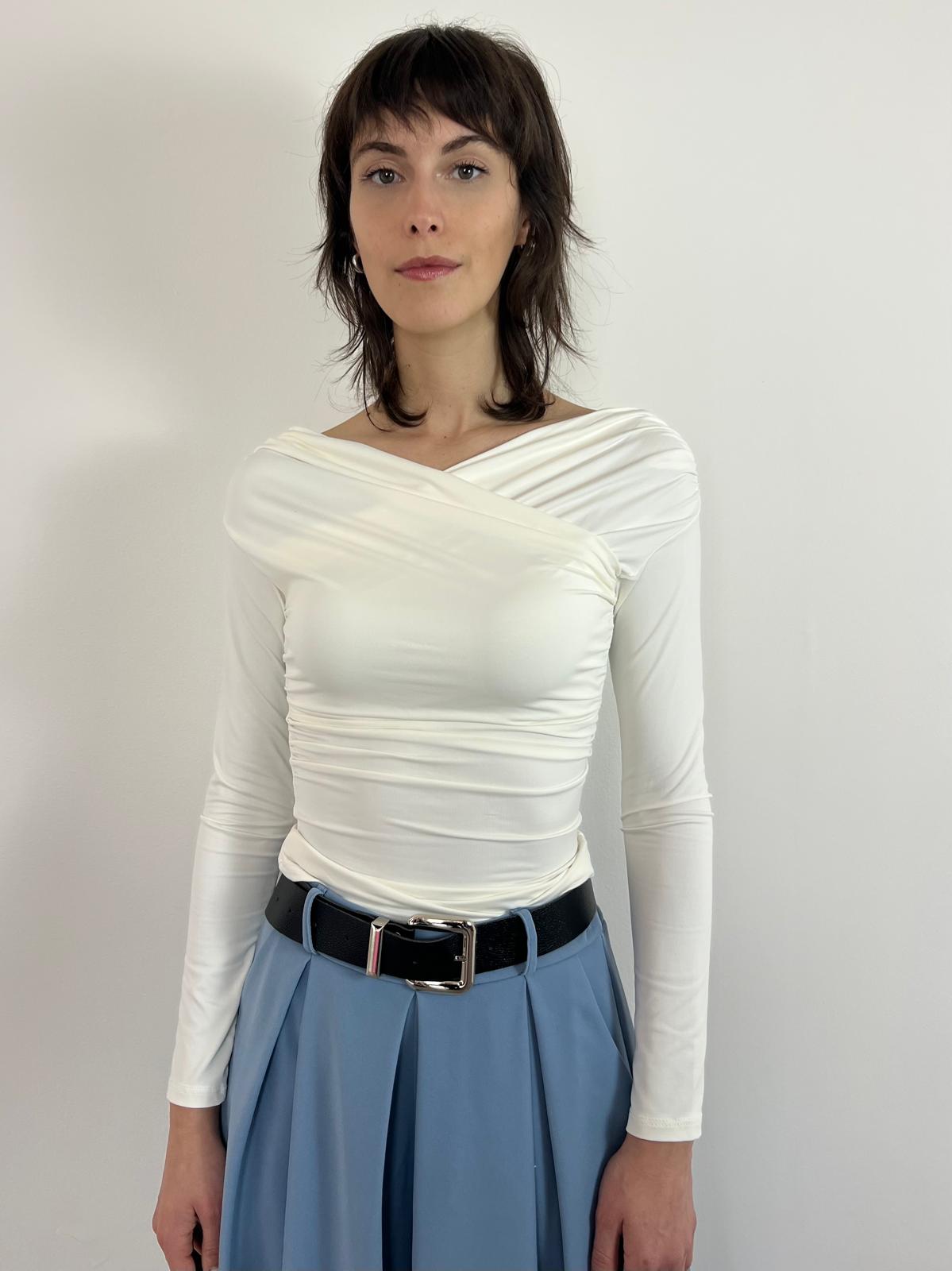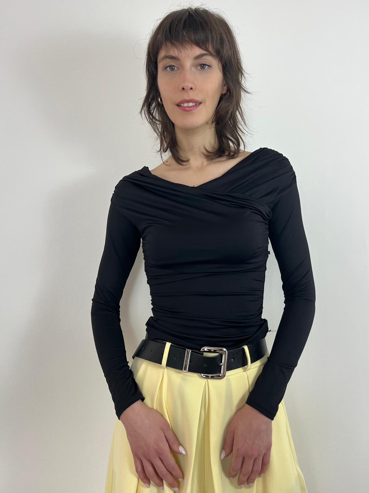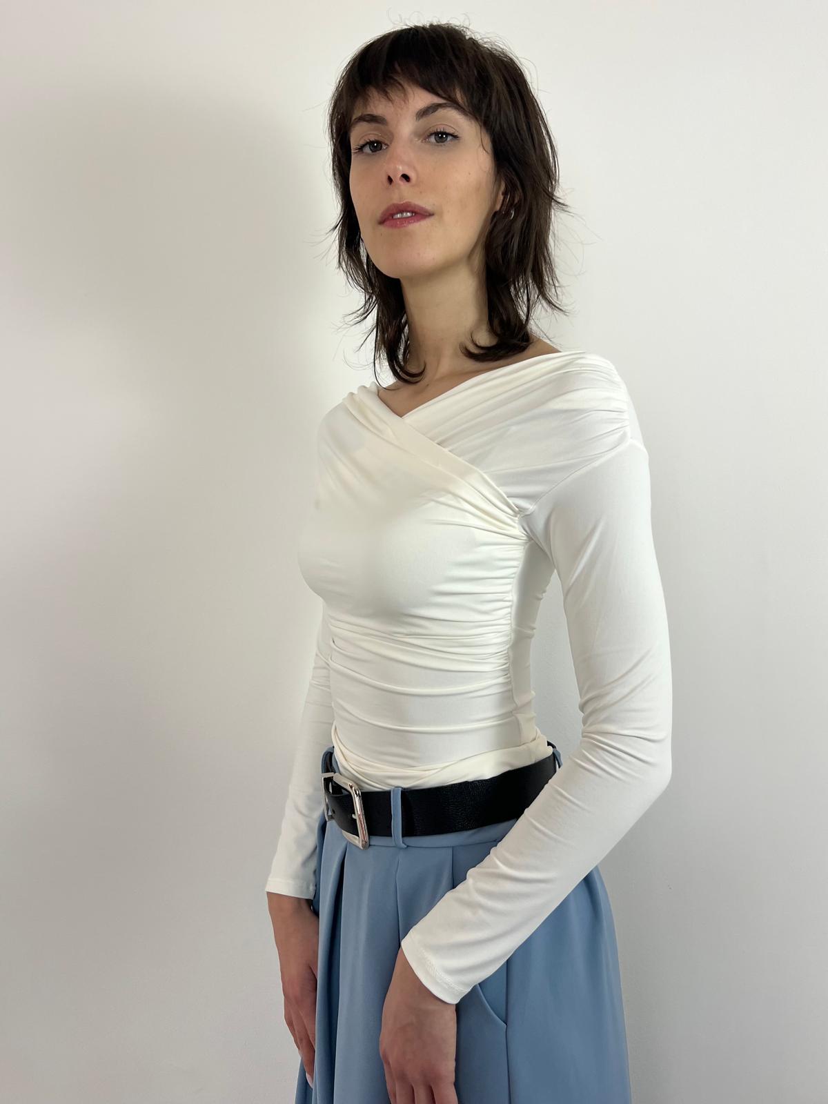 Maglia elegante con scollo incrociato drappeggiato che valorizza il décolleté con raffinatezza. Il tessuto morbido ed elasticizzato abbraccia il corpo garantendo comfort e una silhouette impeccabile. Le maniche lunghe e il taglio aderente creano un capo straordinariamente versatile: indossala di giorno con pantaloni a vita alta per un look sofisticato, oppure di sera sotto un blazer per un'allure ancora più affascinante. Una scelta essenziale per chi ricerca eleganza senza compromessi. Disponibile in bianco e nero. Taglia unica (38-42)