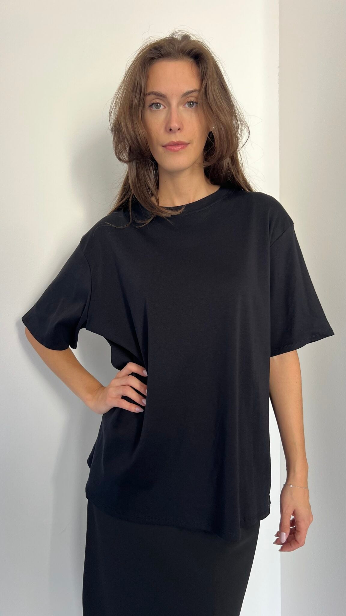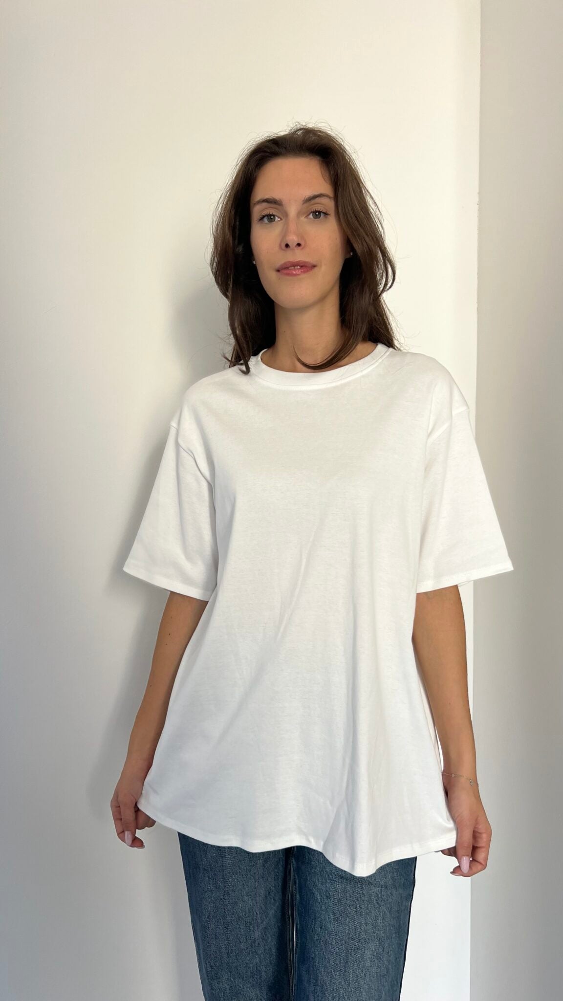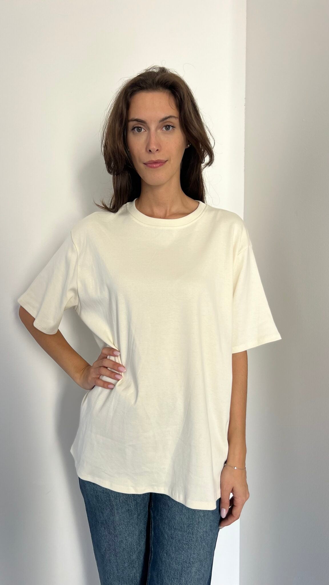 "Maglietta in cotone spesso, maniche a 3/4 per un look versatile. Aggiungi strati per la metà stagione o indossala da sola nella stagione più fredda. Un evergreen per le amanti dell'over, con cotone al 100% per garantire comfort e durata."
