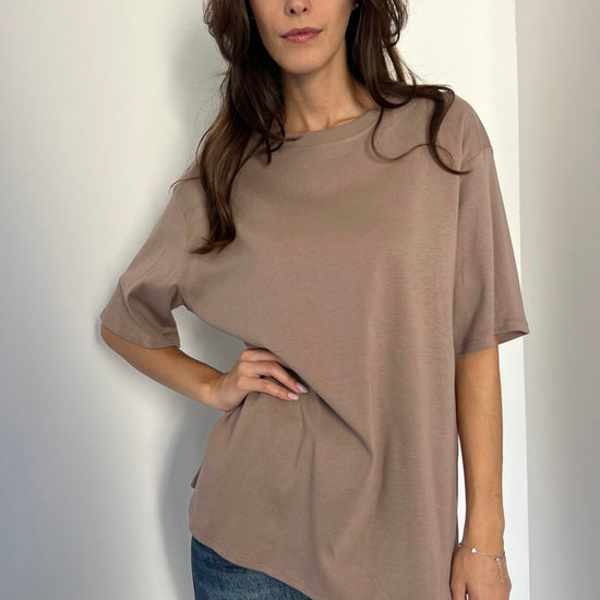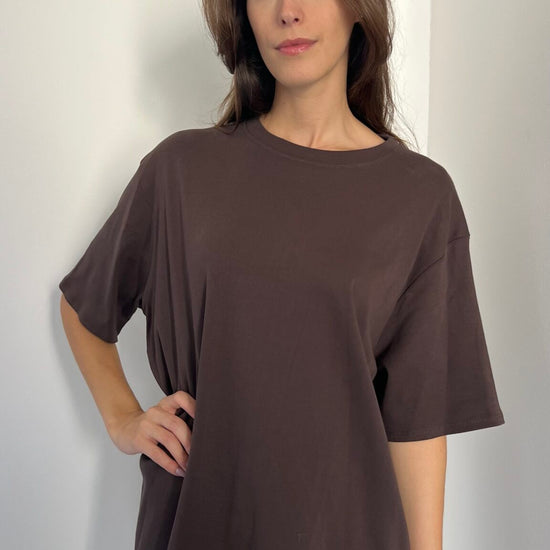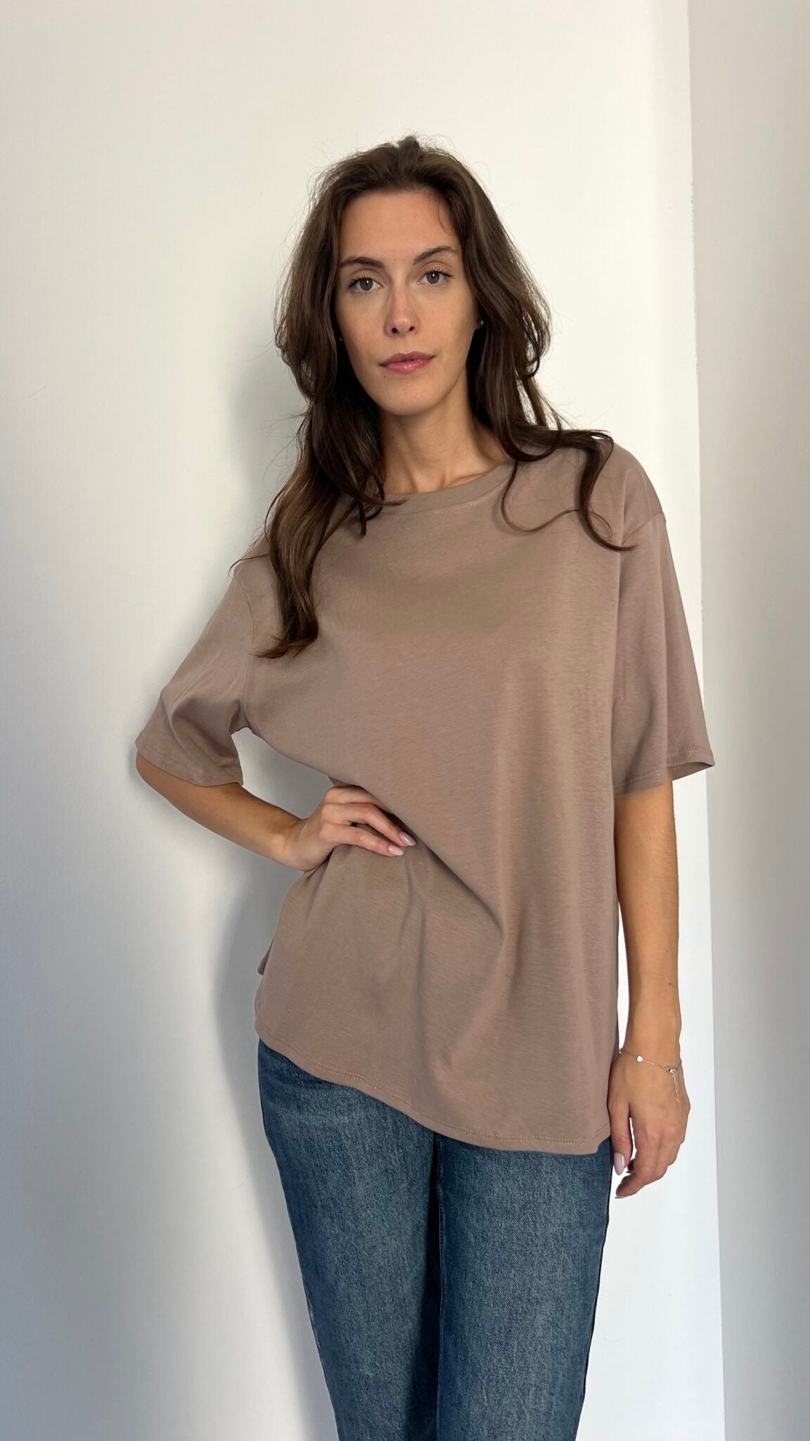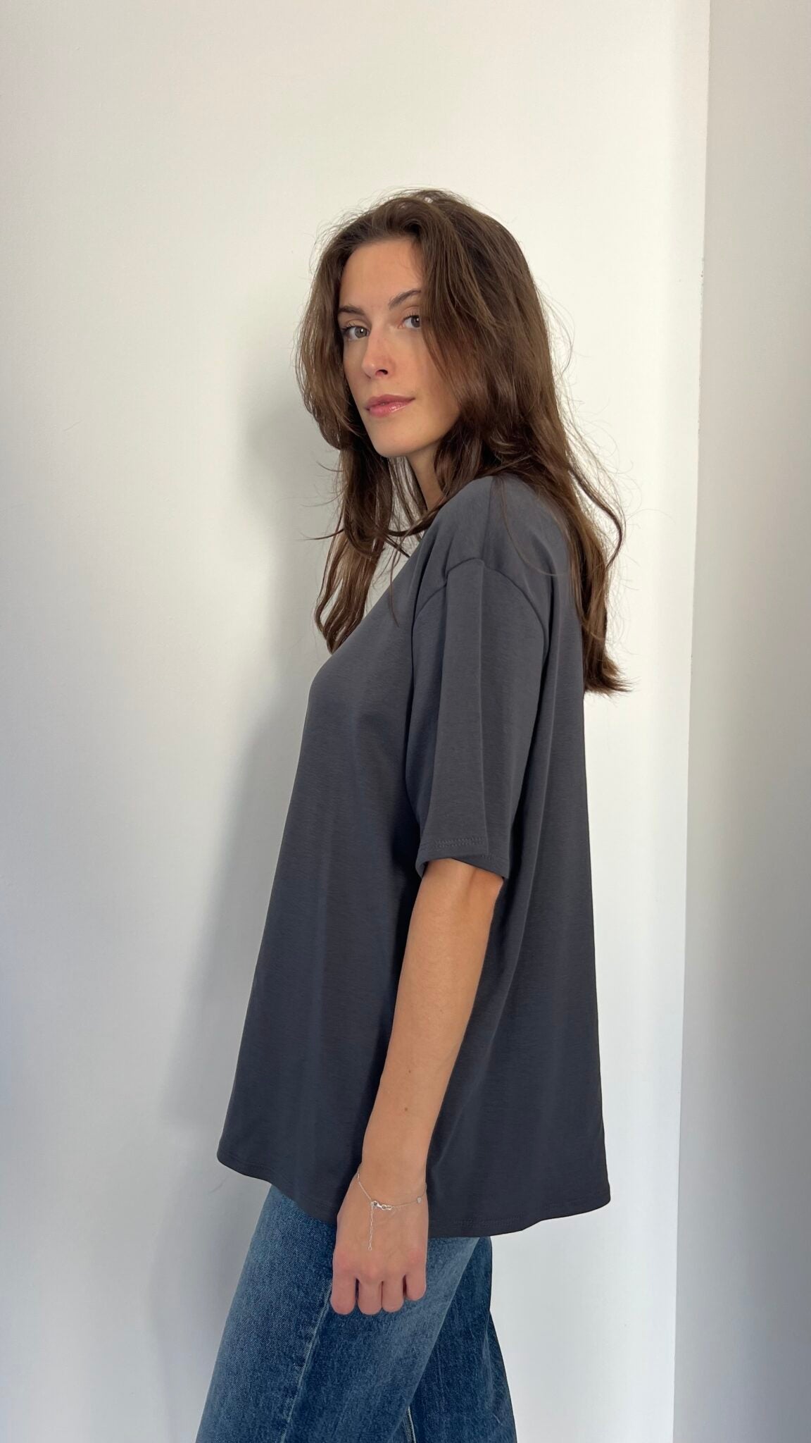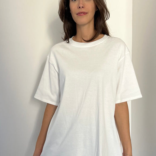 "Maglietta in cotone spesso, maniche a 3/4 per un look versatile. Aggiungi strati per la metà stagione o indossala da sola nella stagione più fredda. Un evergreen per le amanti dell'over, con cotone al 100% per garantire comfort e durata."