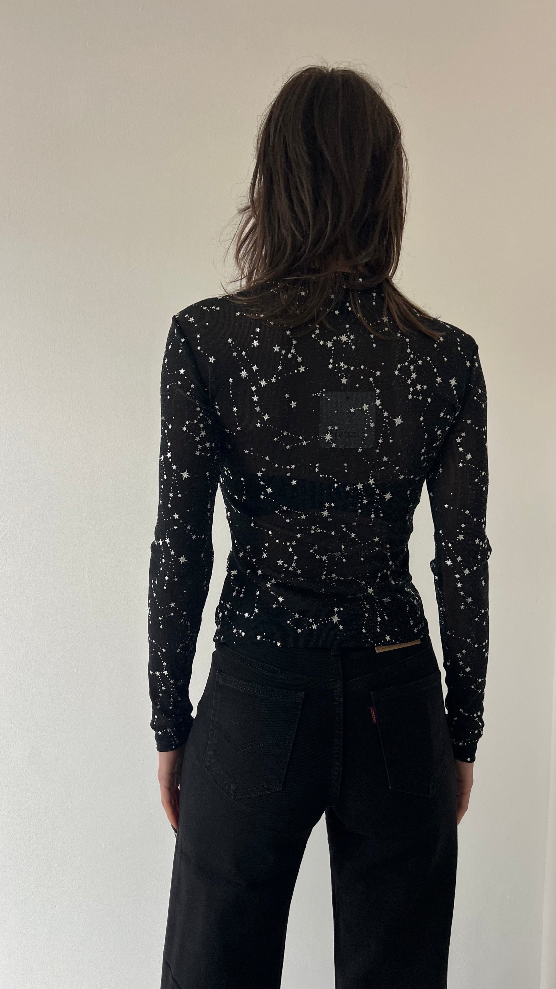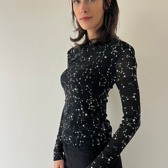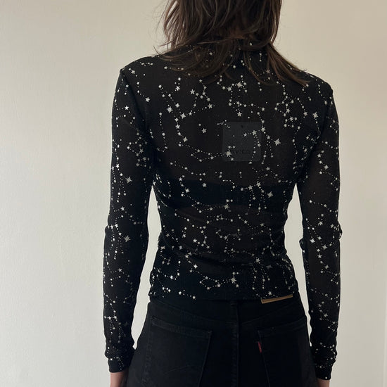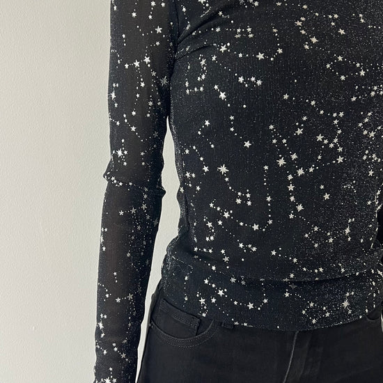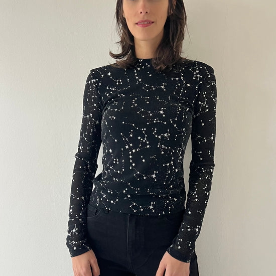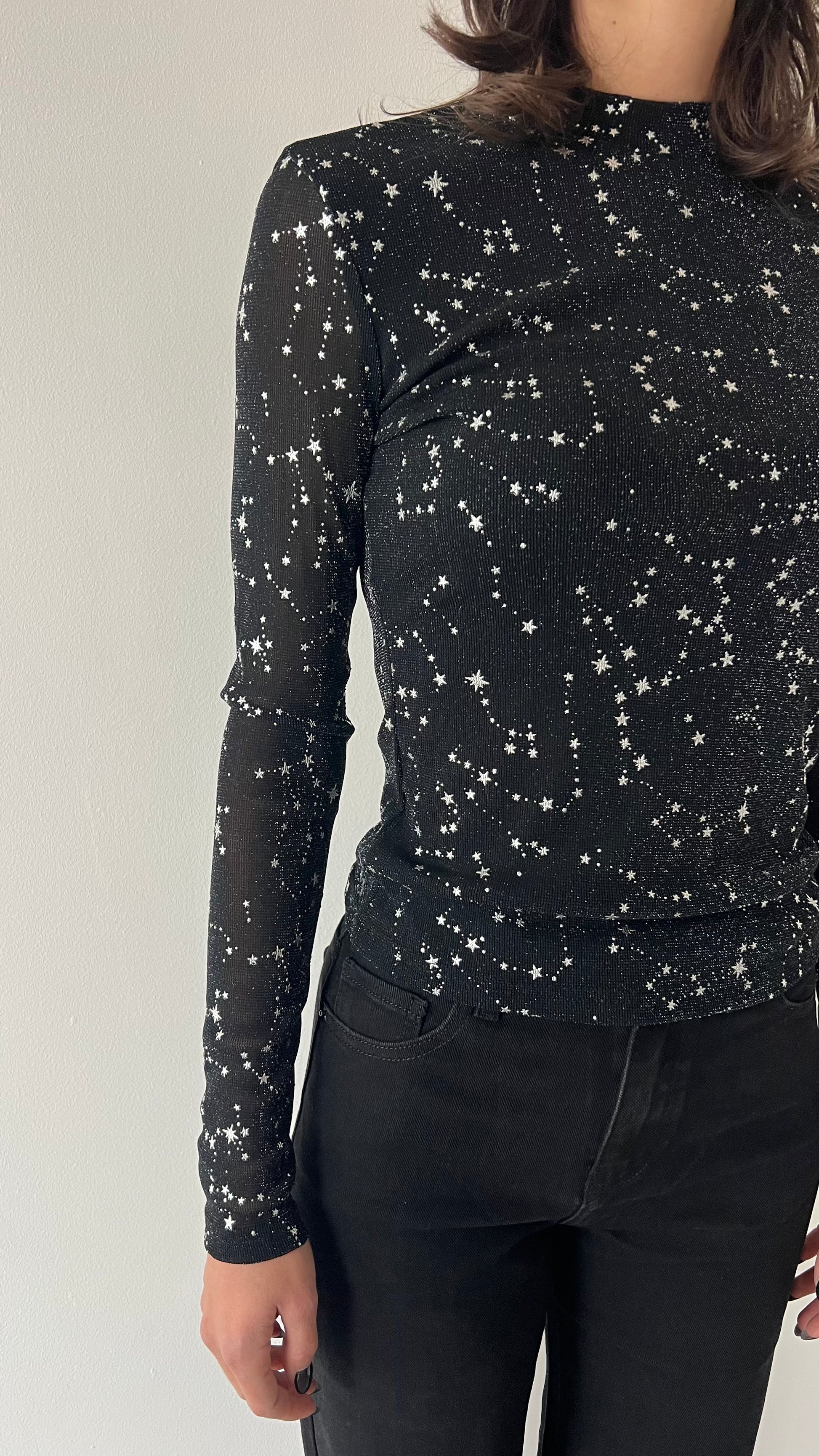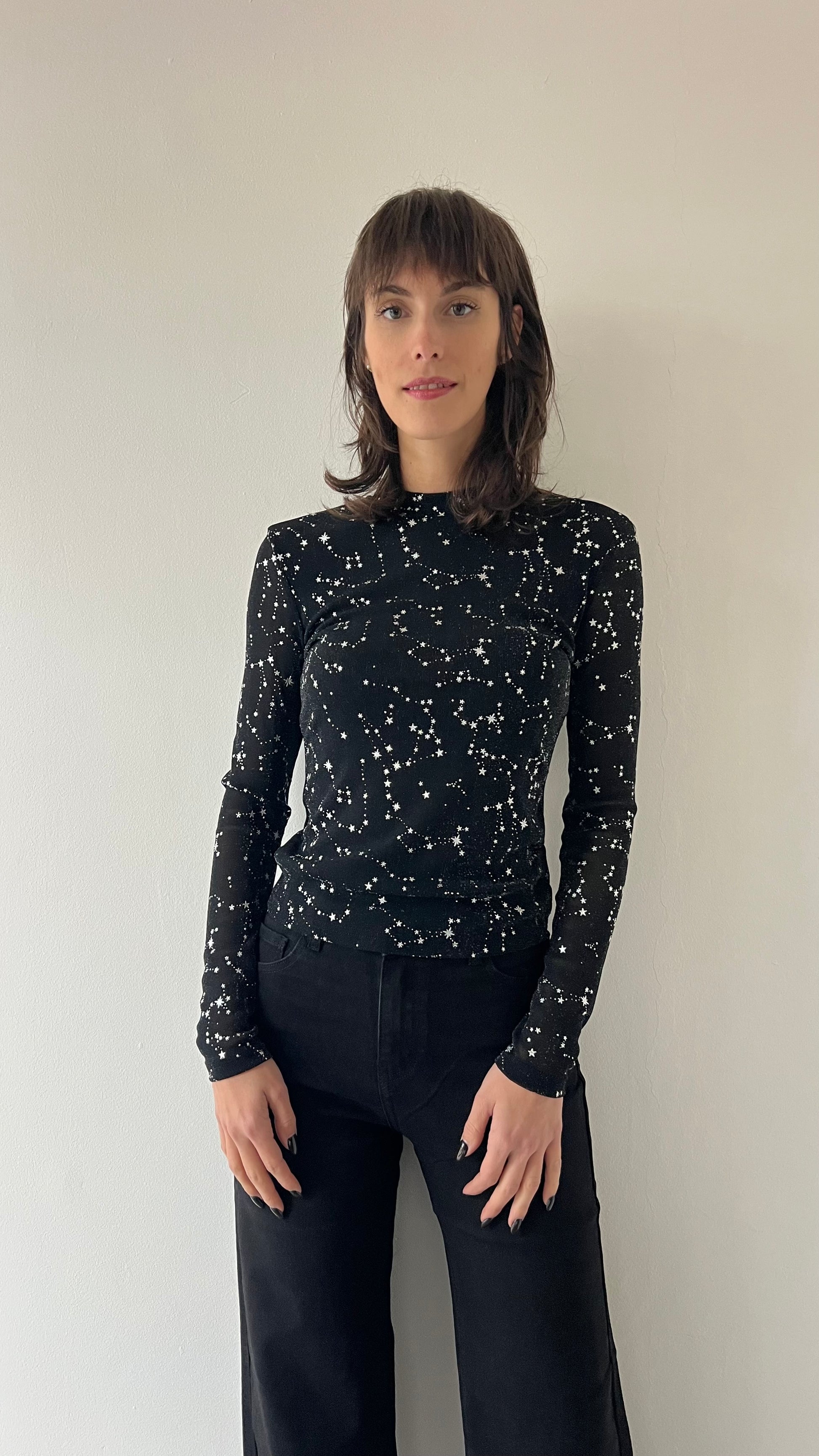 Esaltate la vostra femminilità con la Maglietta stelle. Taglia unica e leggera, la maglia è perfetta per le serate e le festività grazie alle stelle brillanti che vi faranno risplendere. Non passate inosservate e dimostrate la vostra eleganza con questa maglietta unica nel suo genere.