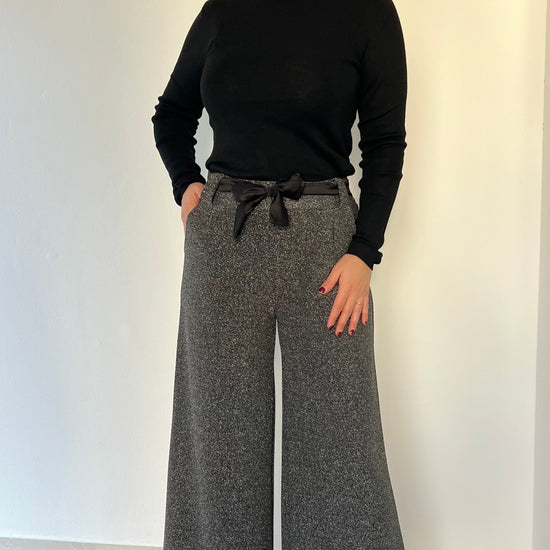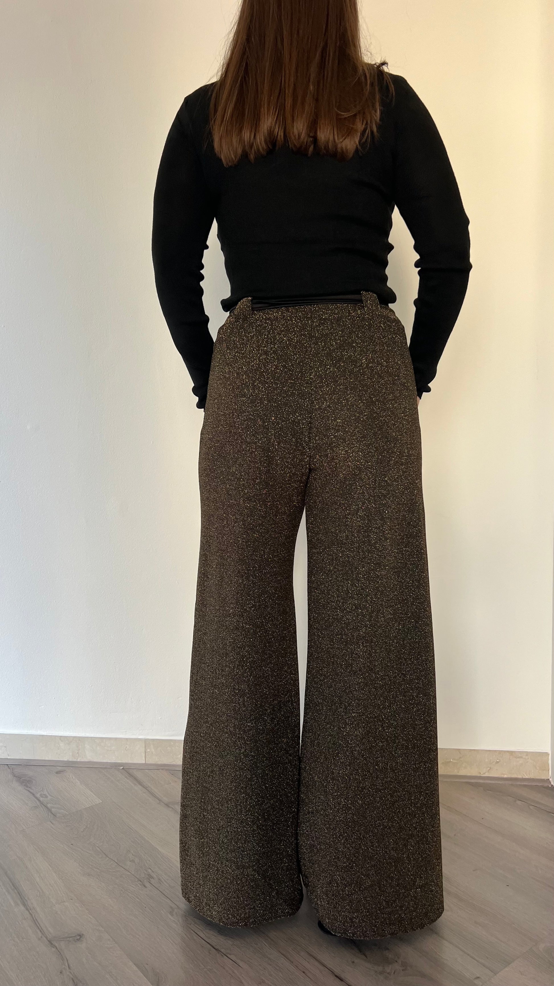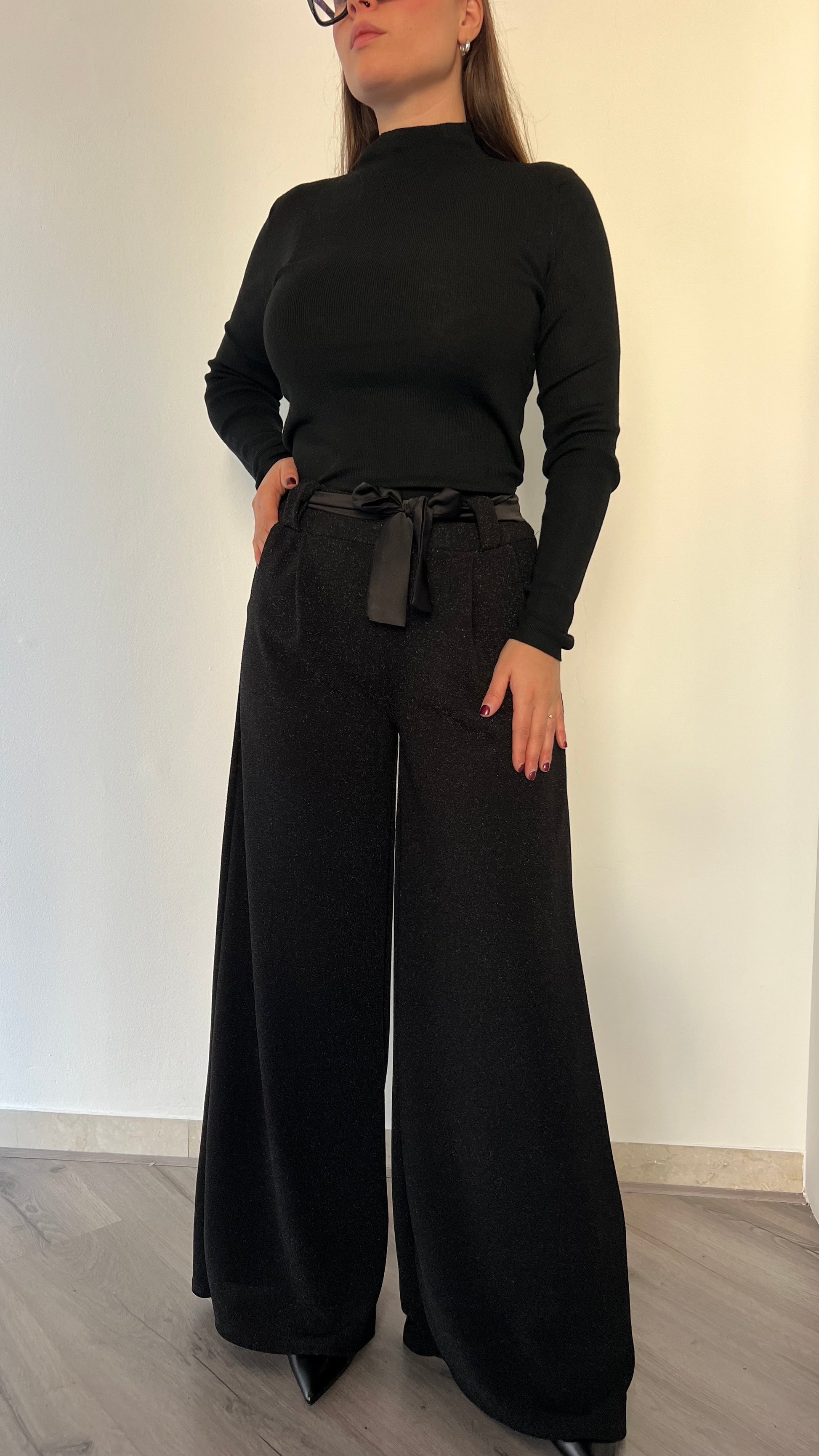Pantalone palazzo con dettagli glitterati e fusciacca coordinata in vita, caratterizzato da elastico per massima comodità. Il tessuto altamente elasticizzato si adatta perfettamente al corpo garantendo libertà di movimento. Consigliato per chi indossa dalla 38 alla 44.
