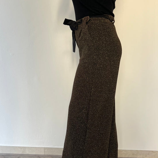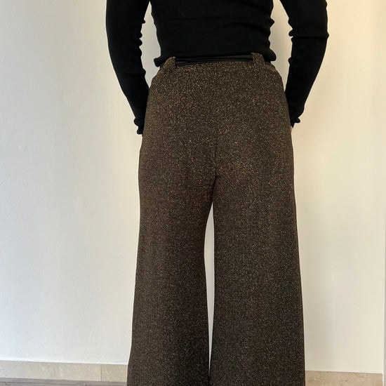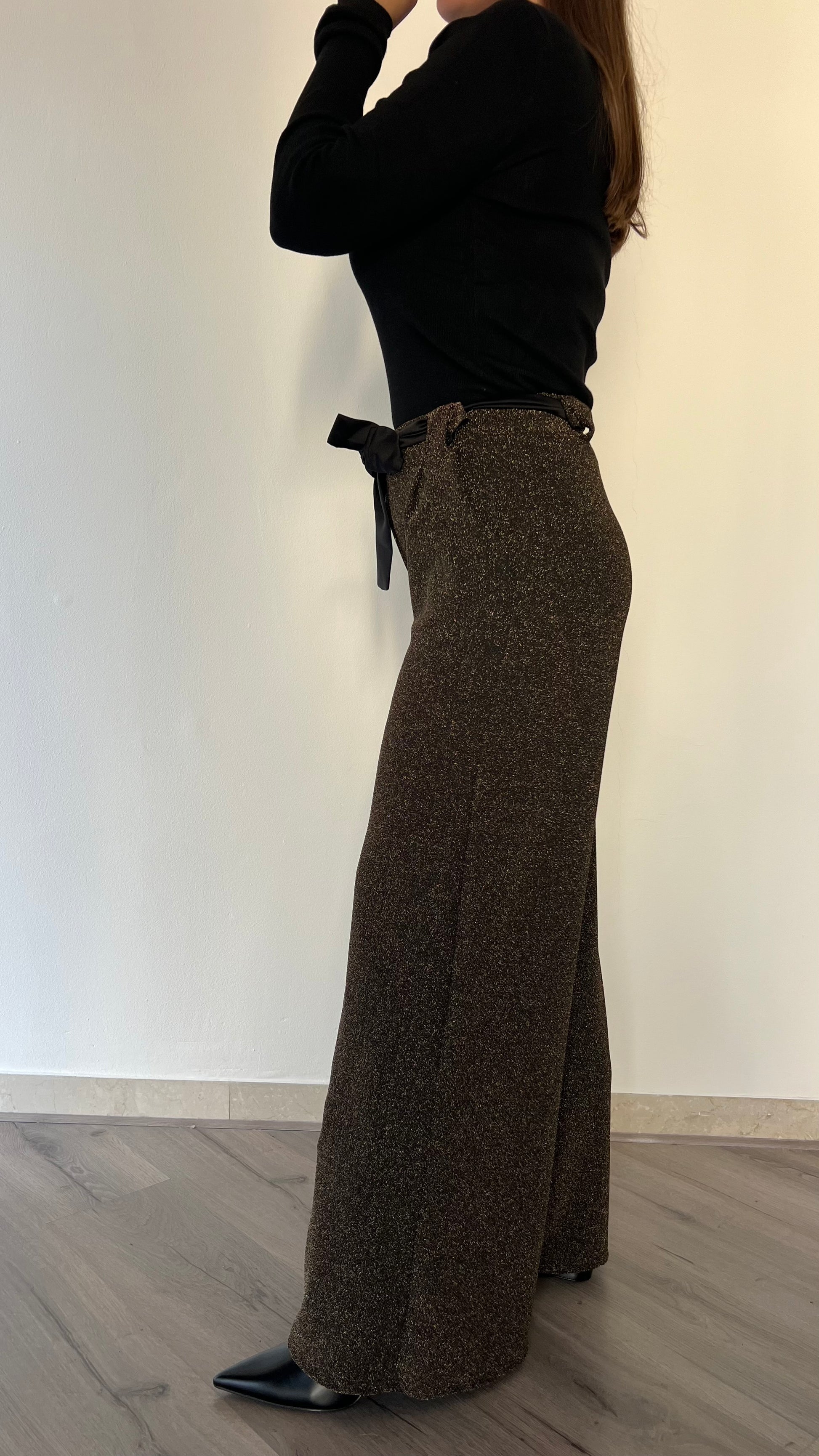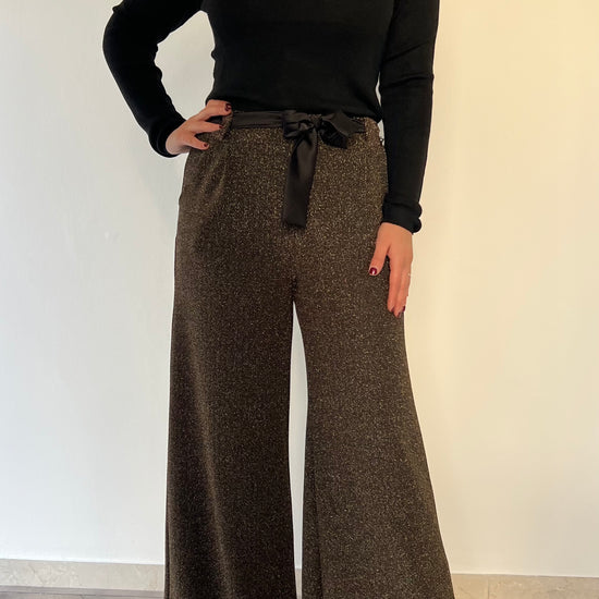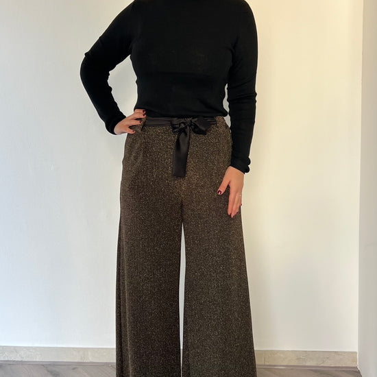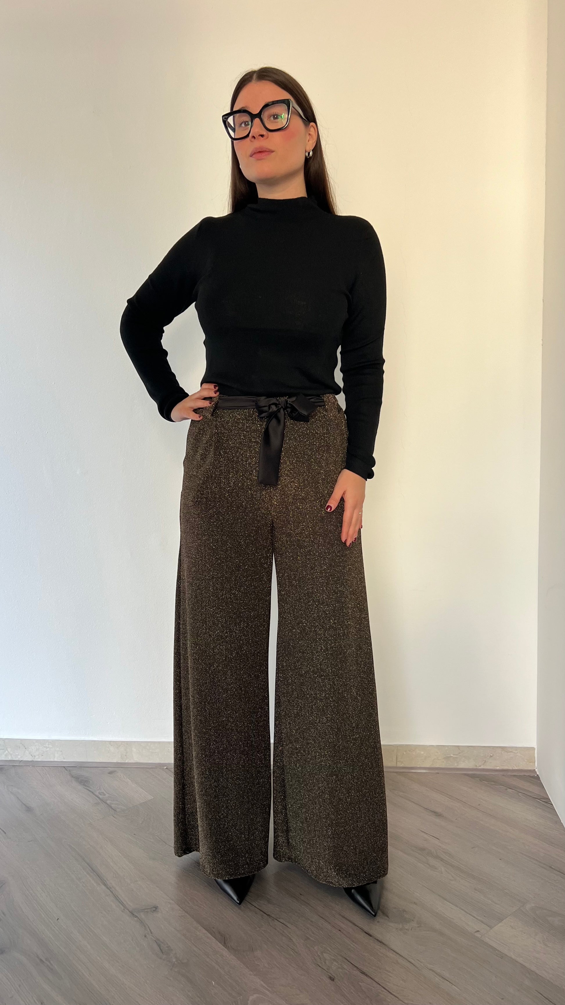 Pantalone palazzo con dettagli glitterati e fusciacca coordinata in vita, caratterizzato da elastico per massima comodità. Il tessuto altamente elasticizzato si adatta perfettamente al corpo garantendo libertà di movimento. Consigliato per chi indossa dalla 38 alla 44.