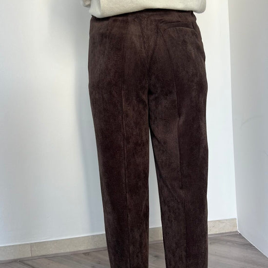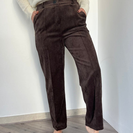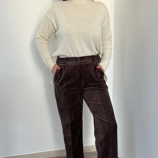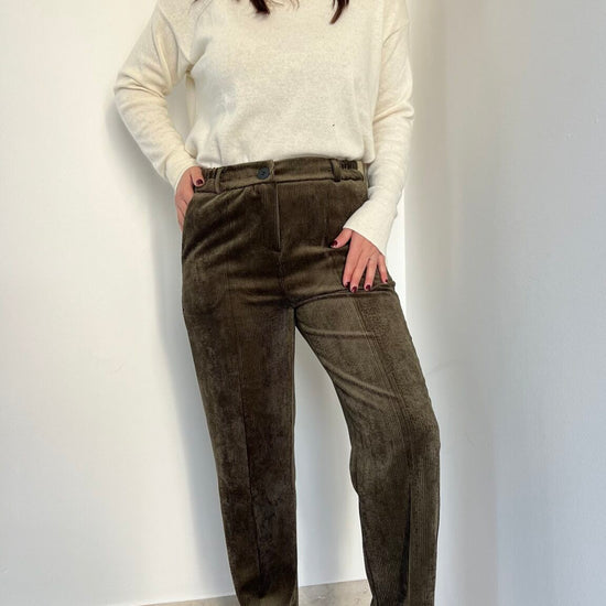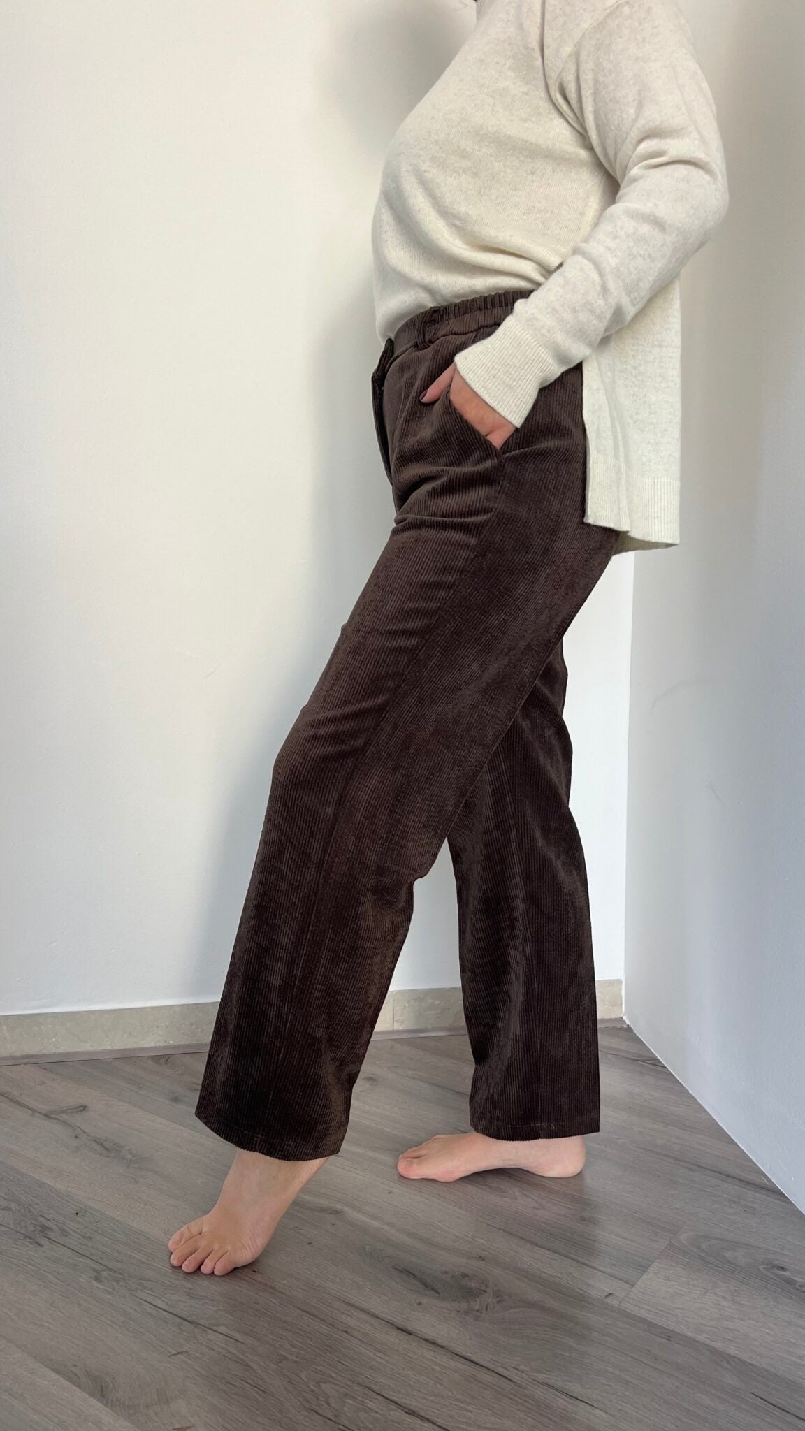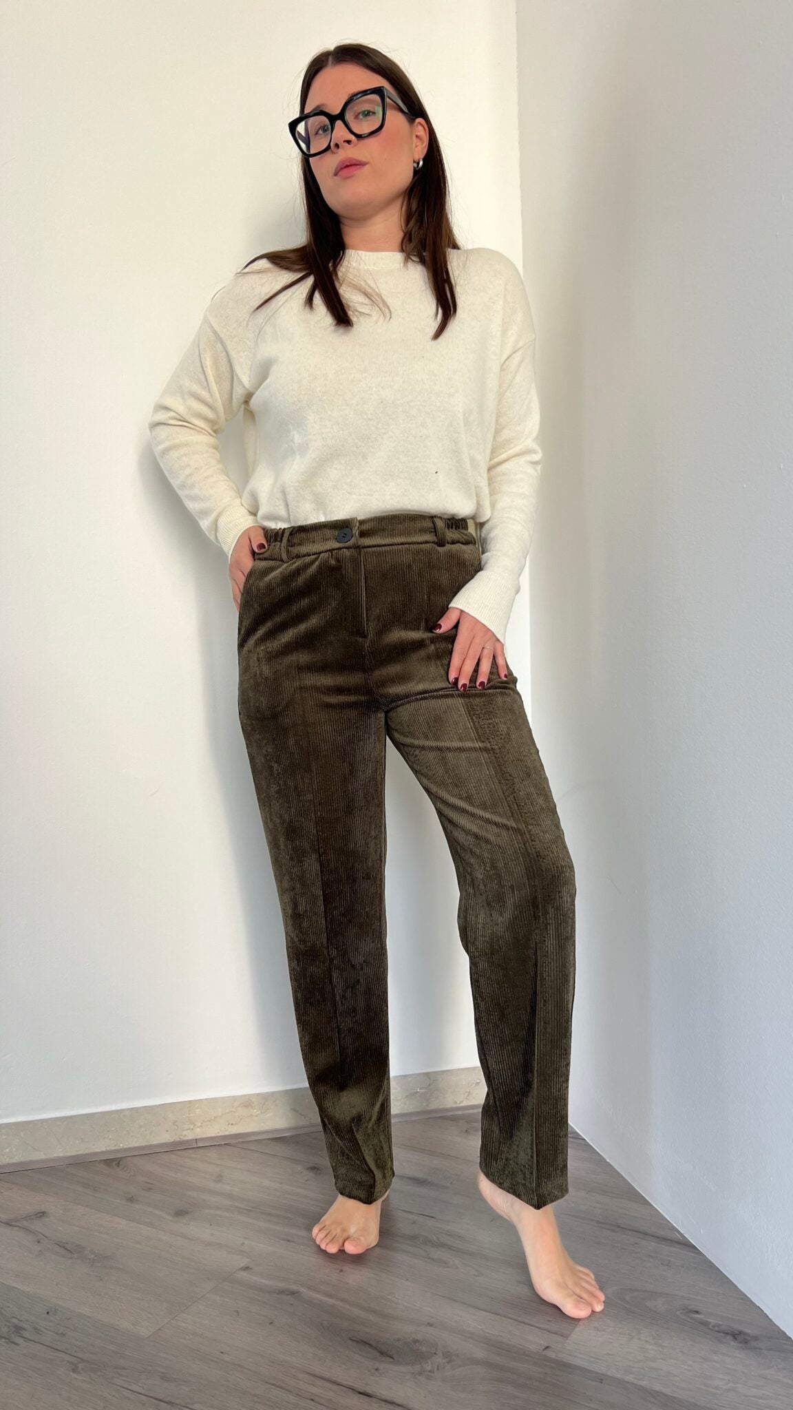 Pantalone in velluto con vita alta disponibile in taglie S(40), M(42), L(44). Realizzato in tessuto rigido non elasticizzato per una linea impeccabile, presenta un'elasticizzazione strategica sulla vita posteriore che assicura co