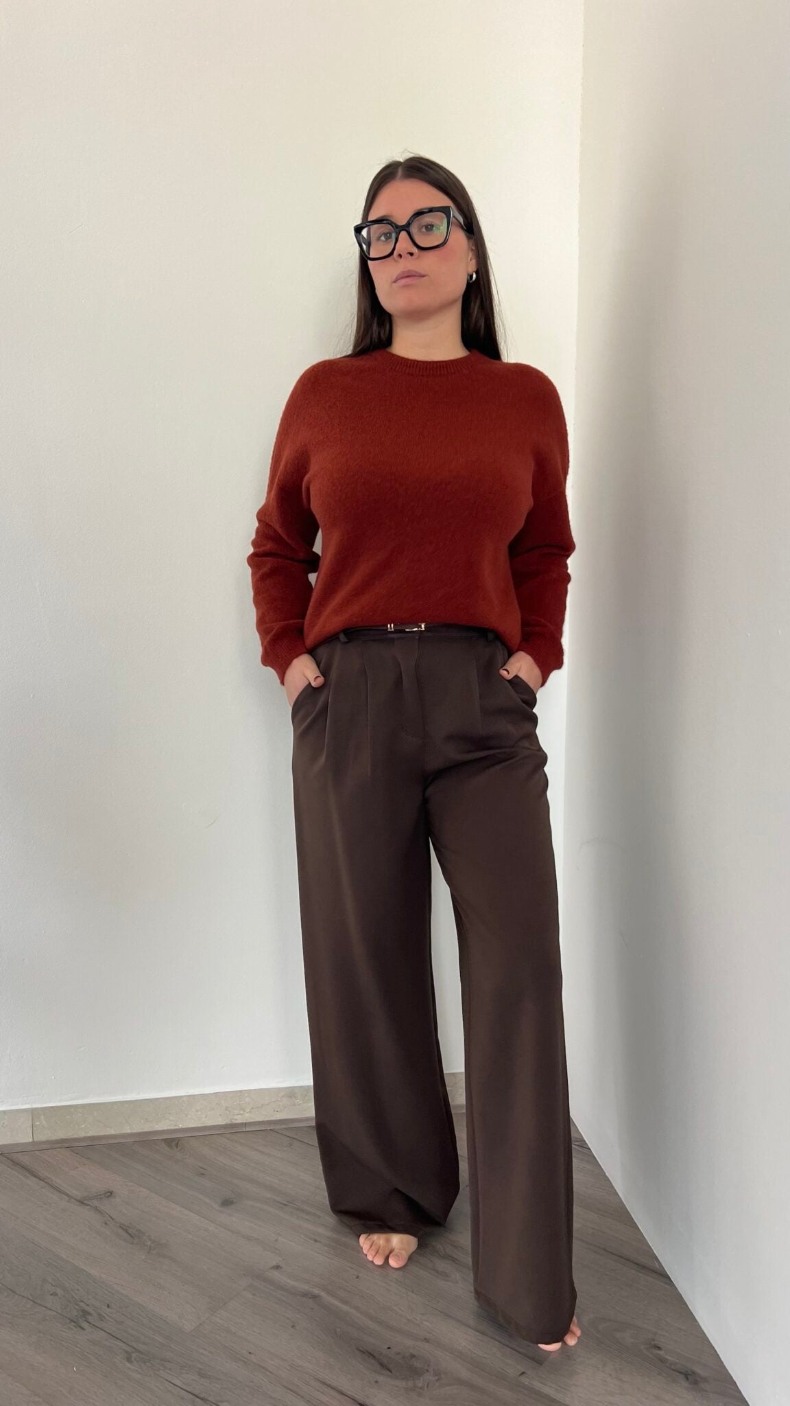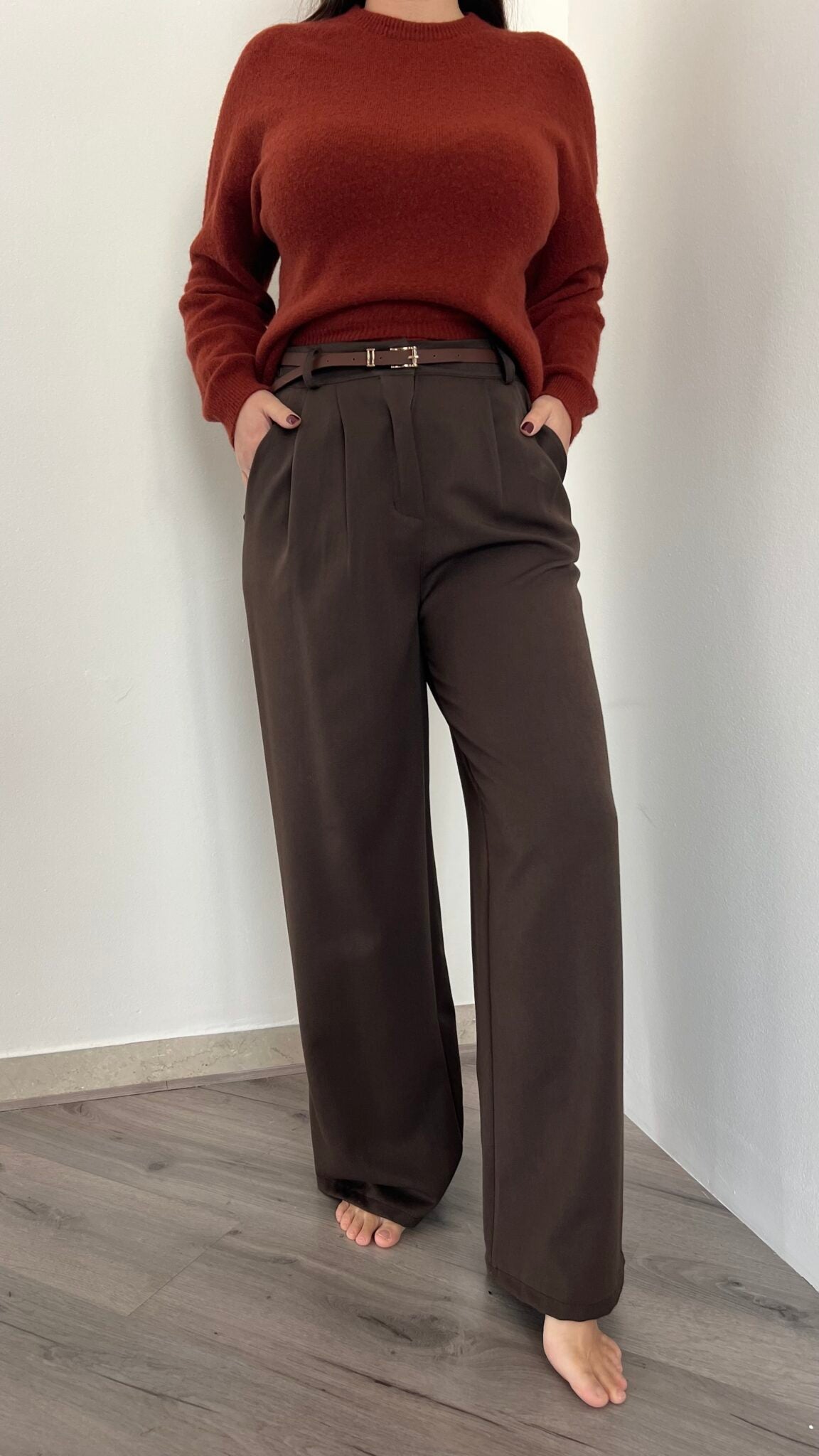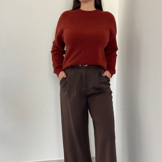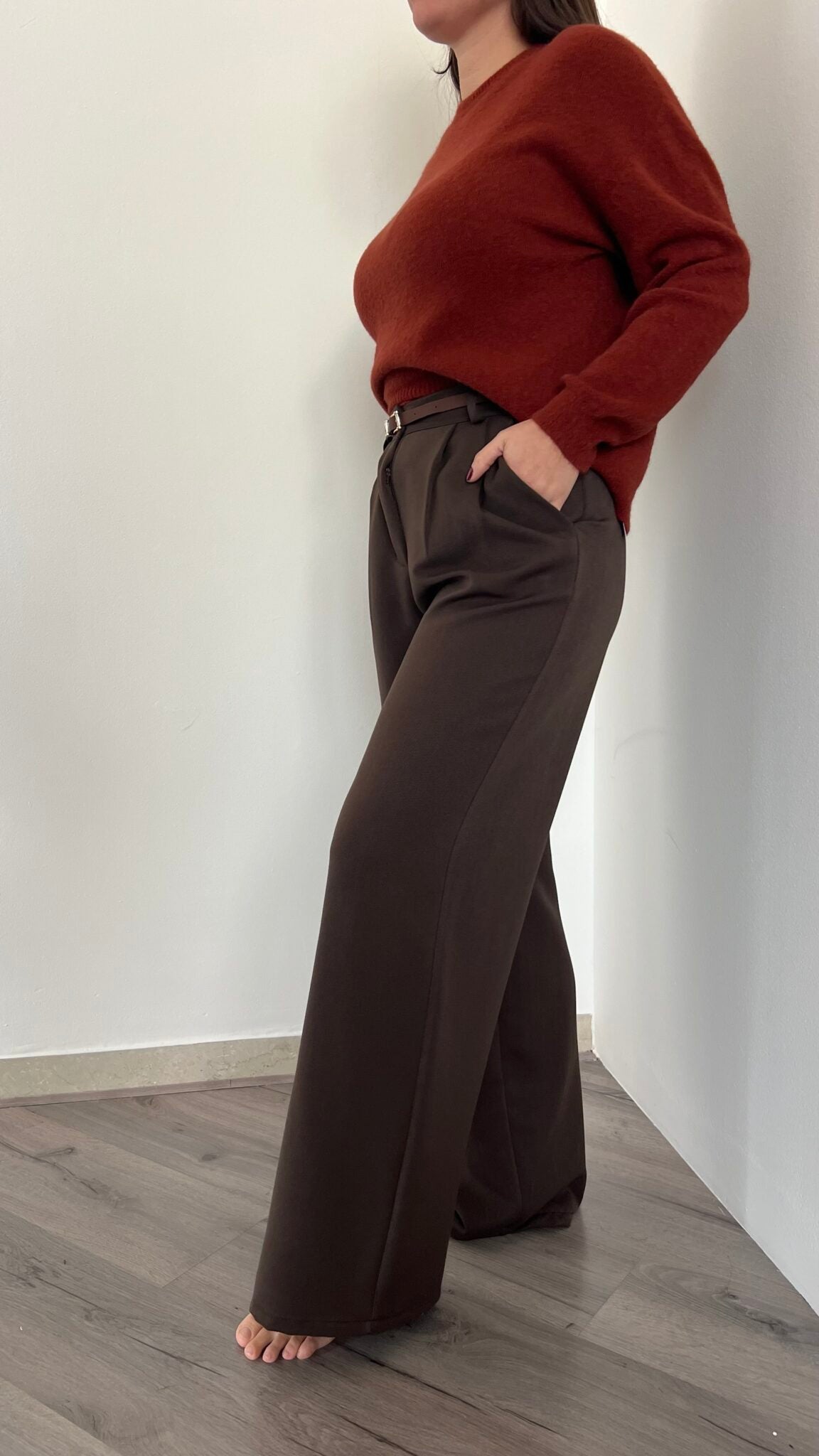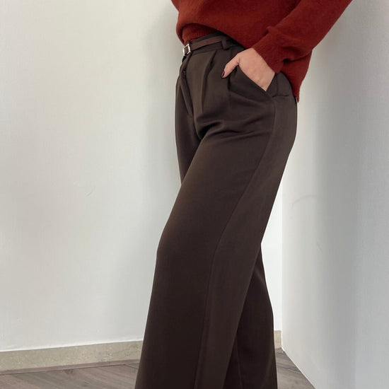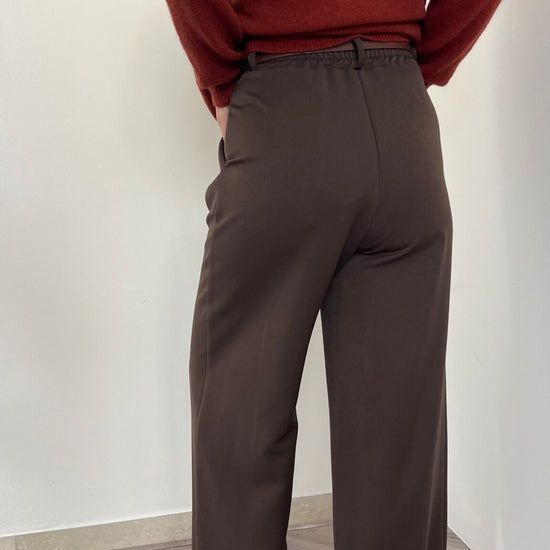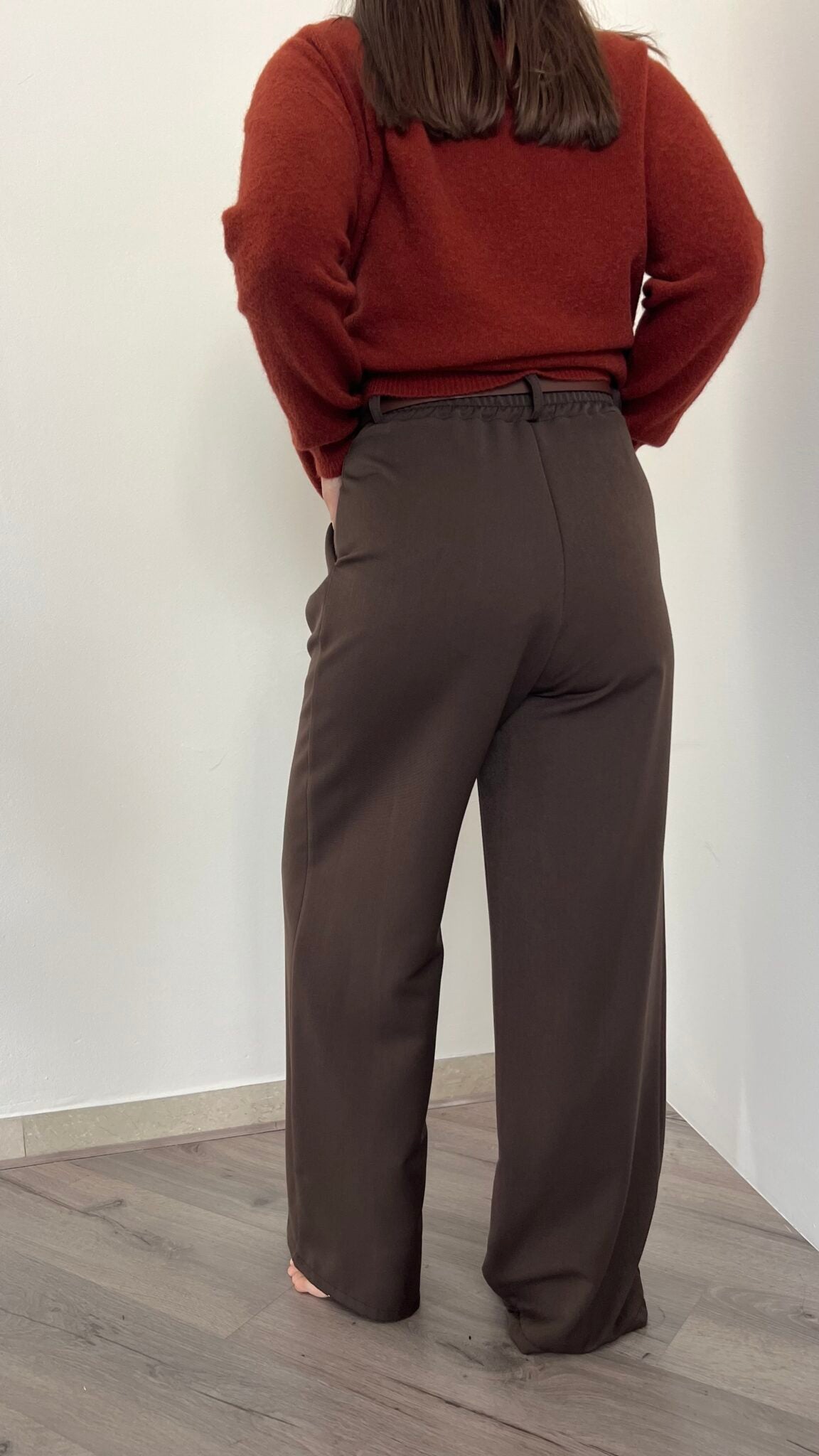 Pantalone palazzo disponibile in quattro taglie: S (38-40), M (42), L (44) e XL (46), per garantire la giusta vestibilità a ogni silhouette. La vita posteriore elasticizzata assicura comfort e libertà di movimento durante la giornata. Un capo versatile e raffinato, perfetto per composizioni sia casual che più formali.