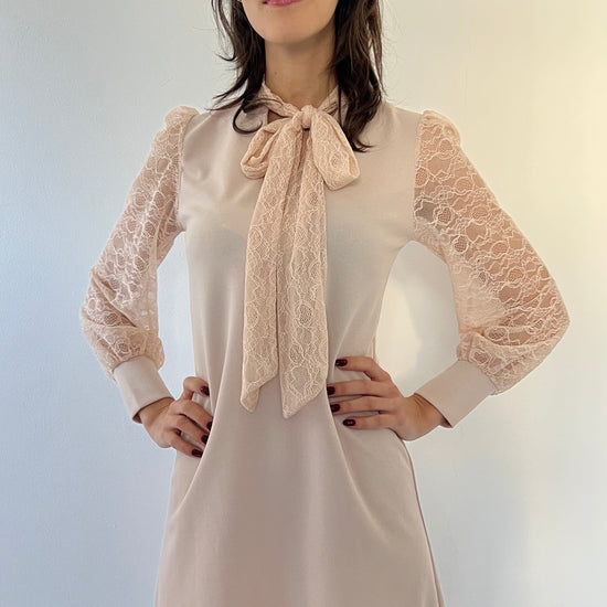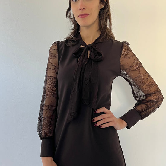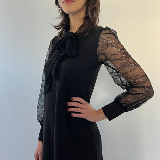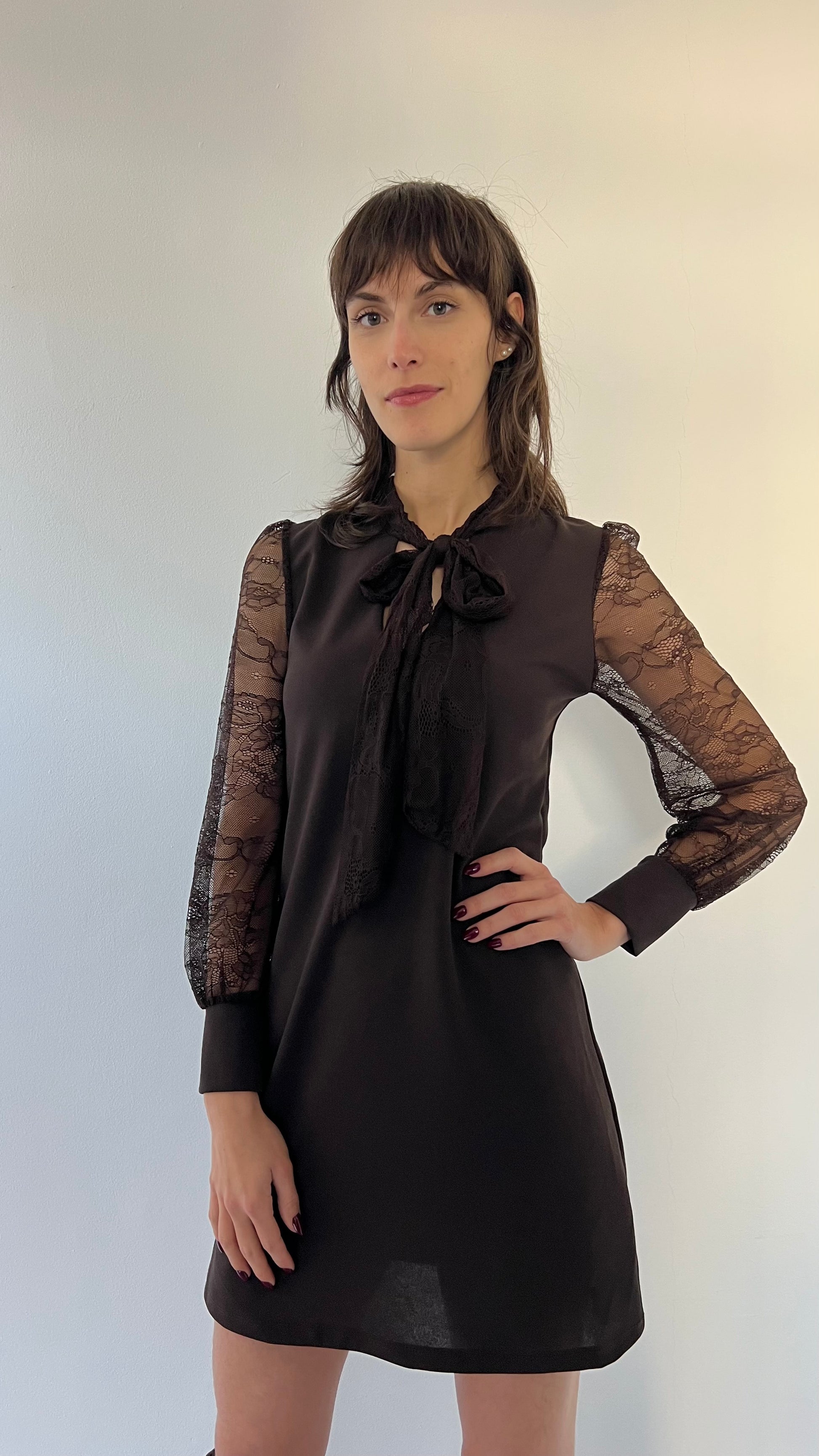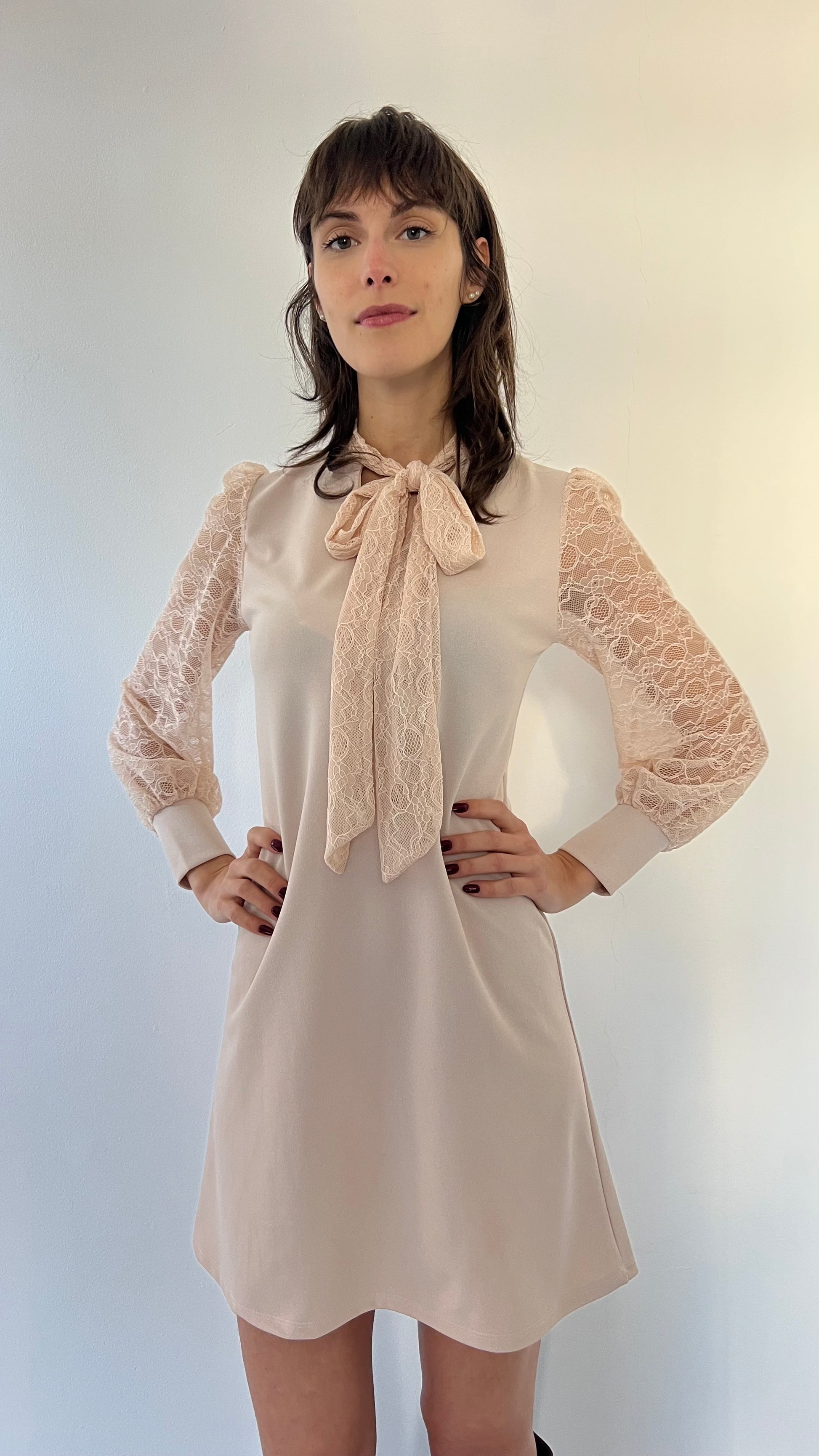 Questo abito Silvia è perfetto per le tue occasioni speciali. La taglia unica vestirà perfettamente dalla 38 alla 44. Le maniche e il fiocco sul collo, entrambi in pizzo, donano un tocco elegante e accattivante. Ideale per le feste e non solo.